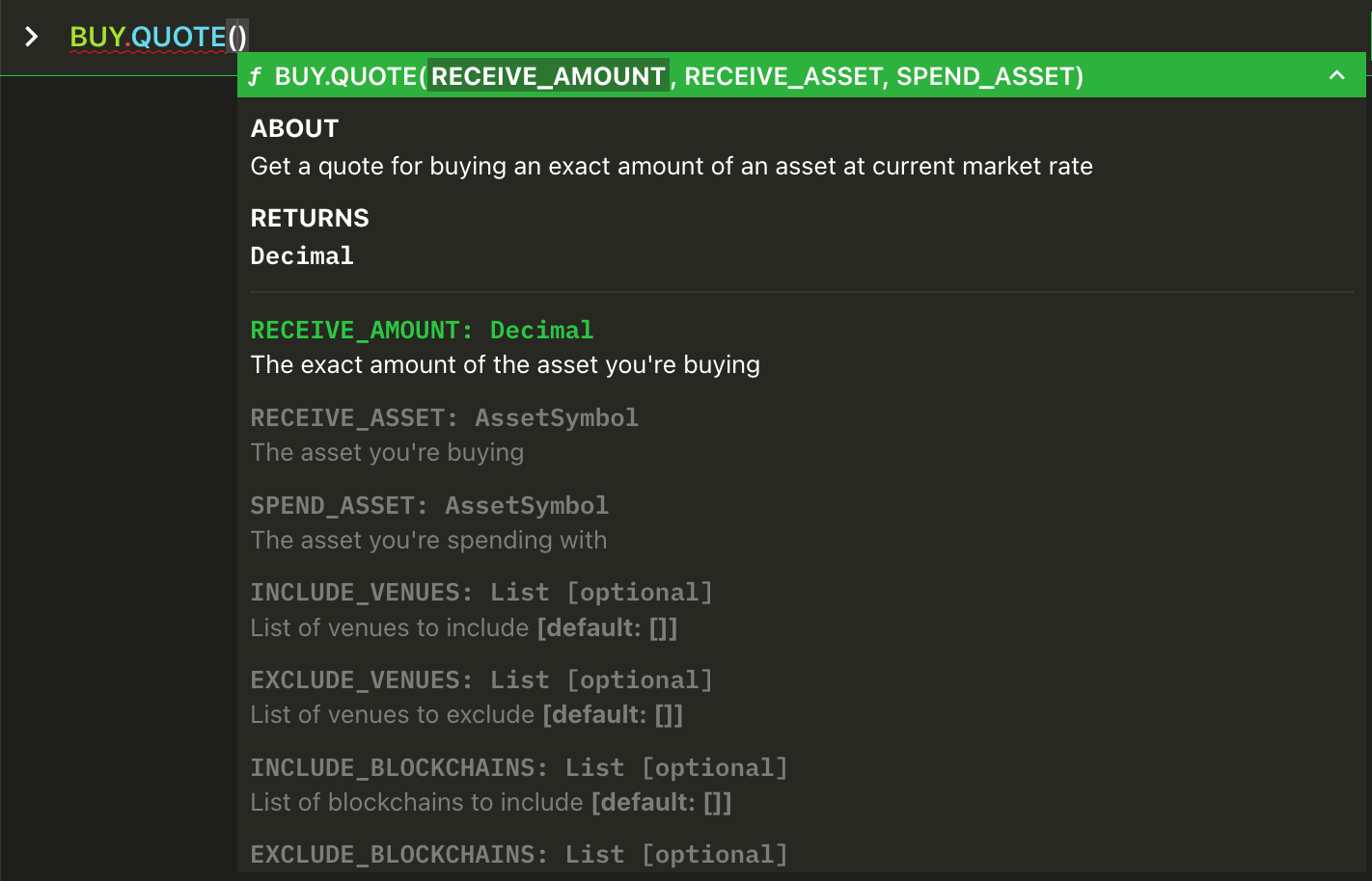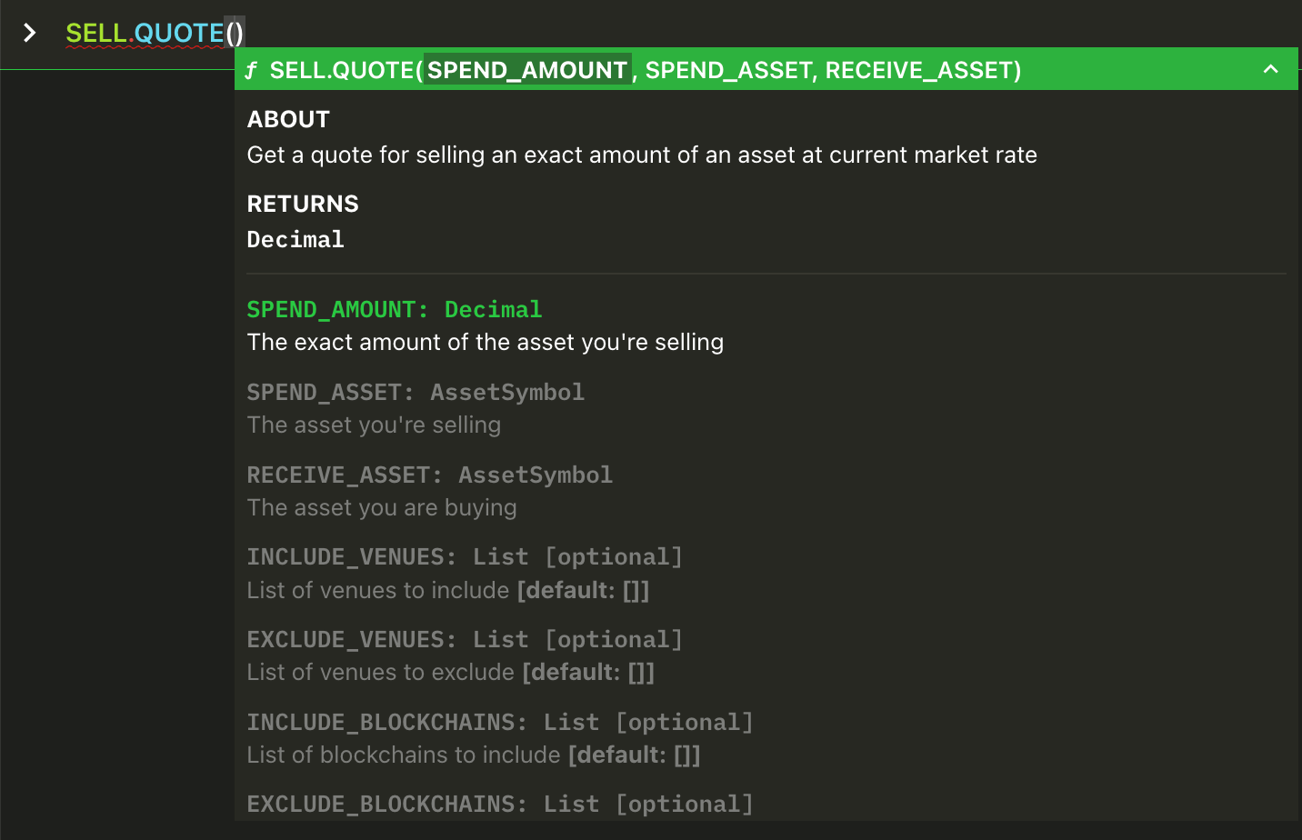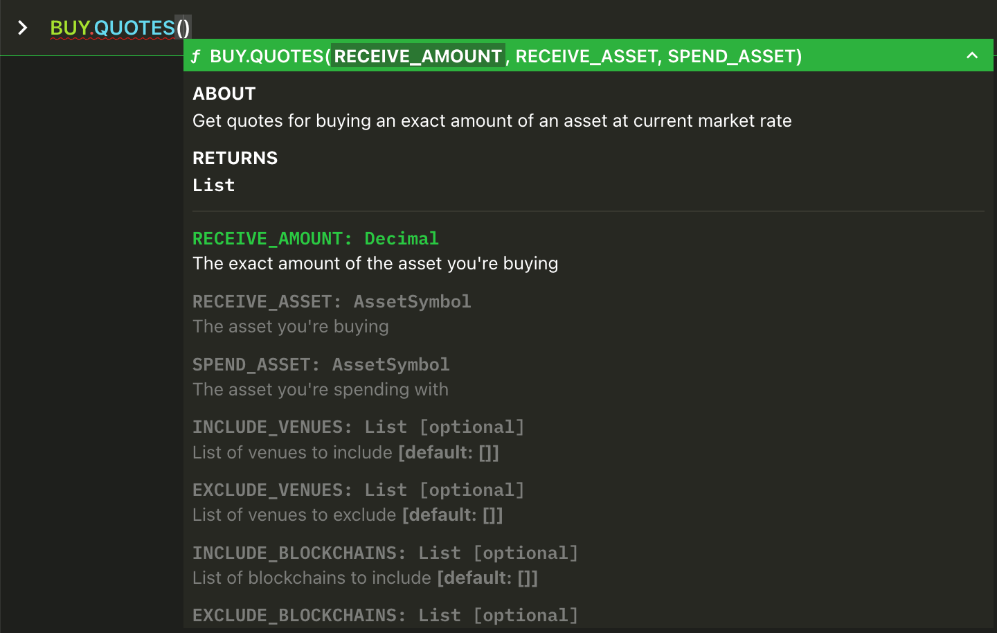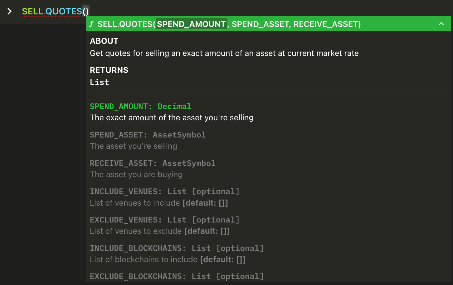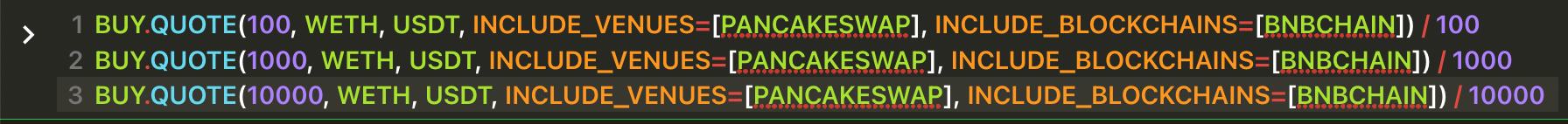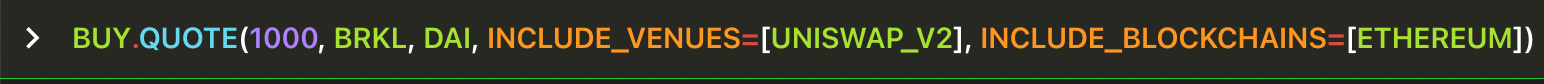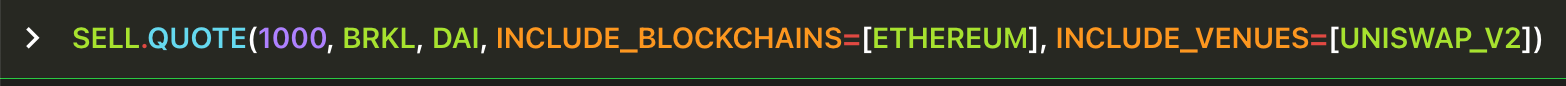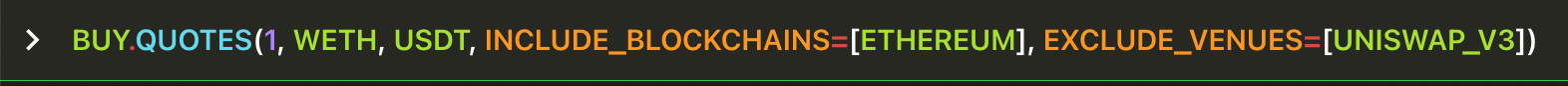 INCLUDE_BLOCKCHAINS , EXCLUDE_BLOCKCHAINS , INCLUDE_VENUES and EXCLUDE_VENUES are optional arguments, so they must be represent by key=value (Python style). In this instance the value can be a list of venues, so use array notation [venue1,venue2,venue3].Get three separate quotes at the same time, all of them for buying 1 WETH spending USDC, querying three different blockchains.