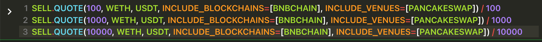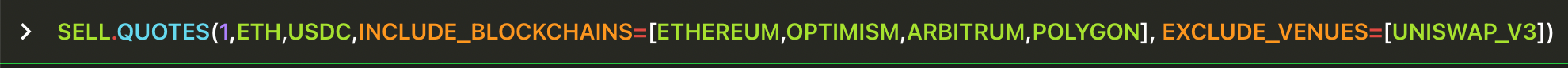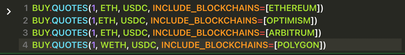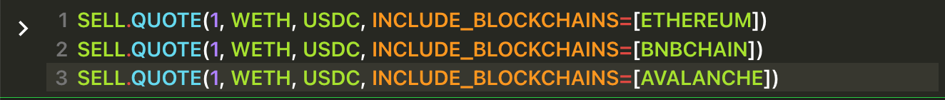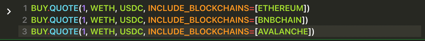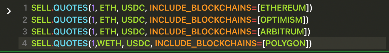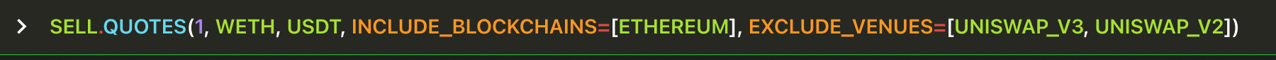 INCLUDE_BLOCKCHAINS , EXCLUDE_BLOCKCHAINS , INCLUDE_VENUES and EXCLUDE_VENUES are optional arguments, so they must be represent by key=value (Python style). In this instance the value can be a list of venues, so use array notation [venue1,venue2,venue3].Get three separate quotes at the same time, all of them for selling 1 WETH receiving USDC, querying three different blockchains.