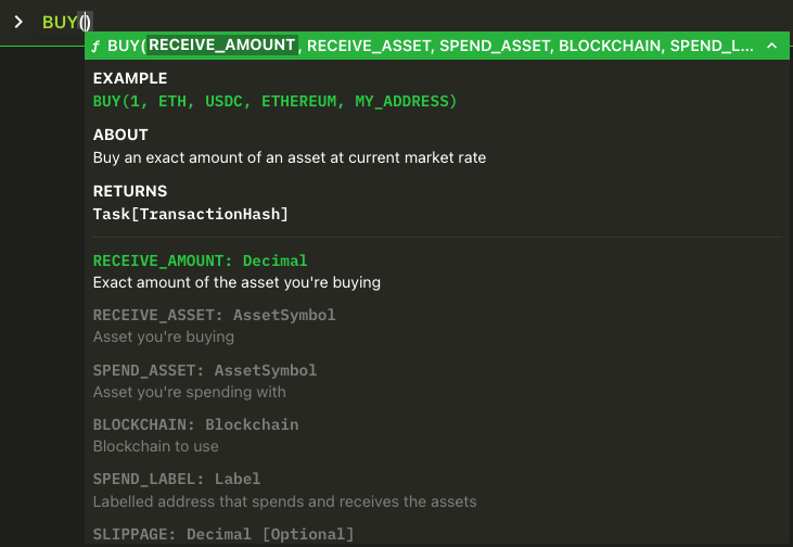 BUYfunction to buy an exact amount of an asset at the current market rate (i.e. known “receive” amount). - Use the