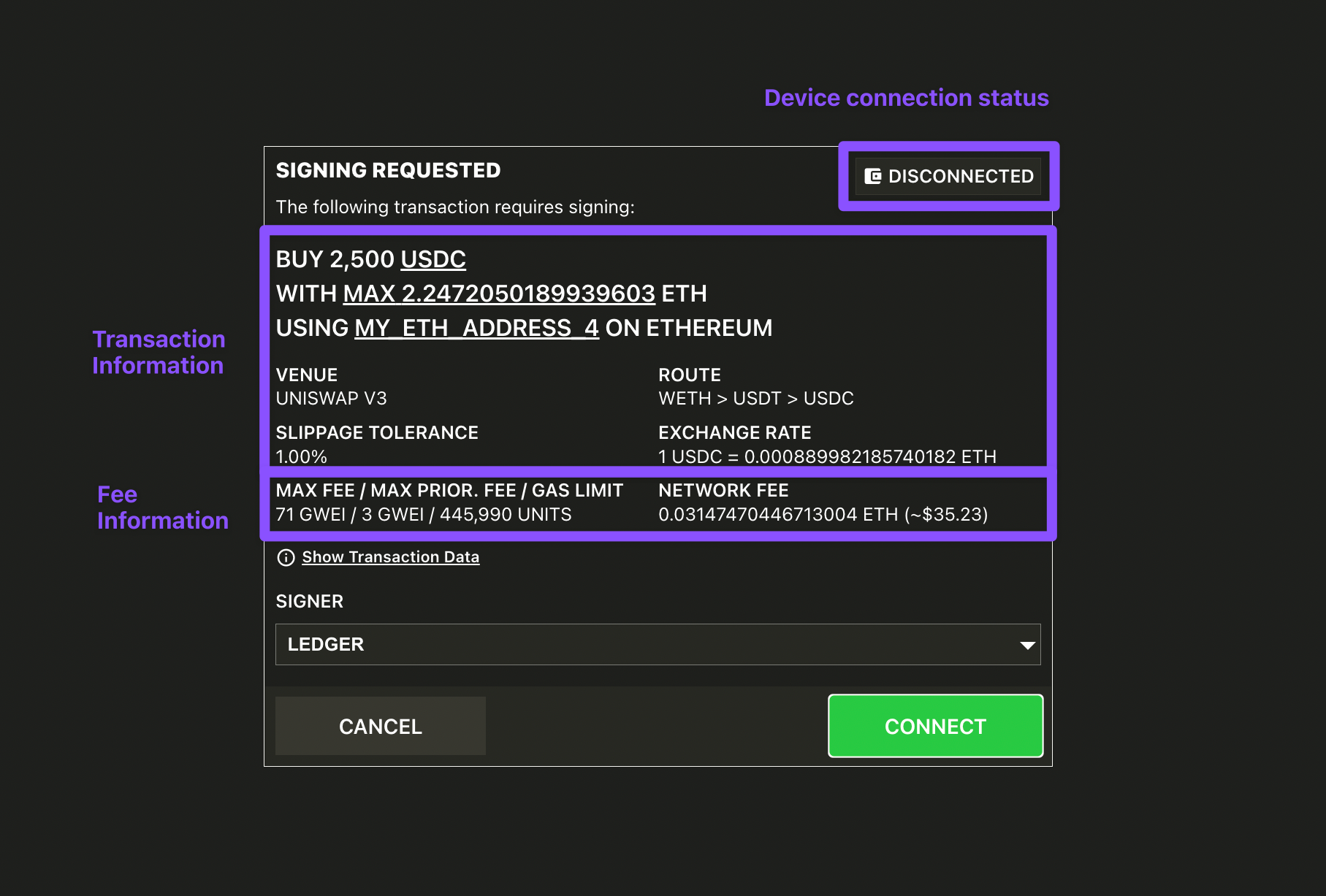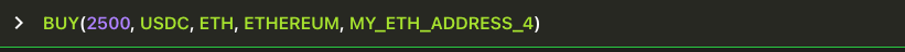 Buy exactly 2500 USDC using my ETH on Ethereum, using the labelled address MY_ETH_ADDRESS_4 (with sample Signing Request).