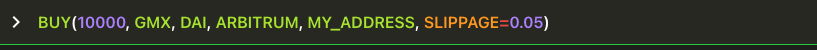 Buy exactly 10,000 GMX using my DAI on Arbitrum, using the labelled address MY_ADDRESS , and override default 1% slippage to set at 5%.