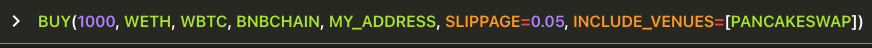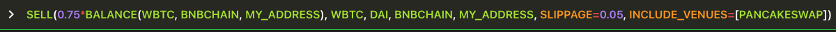 SELL(0.75*BALANCE(WBTC, BNBCHAIN, MY_ADDRESS), WBTC, DAI, BNBCHAIN, MY_ADDRESS, SLIPPAGE=0.05, INCLUDE_VENUES=[PANCAKESWAP])