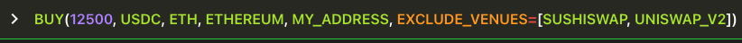 Buy exactly 12,500 USDC, using my ETH on Ethereum, using the labelled address MY_ADDRESS, and exclude venues Sushiswap and Uniswap v2.