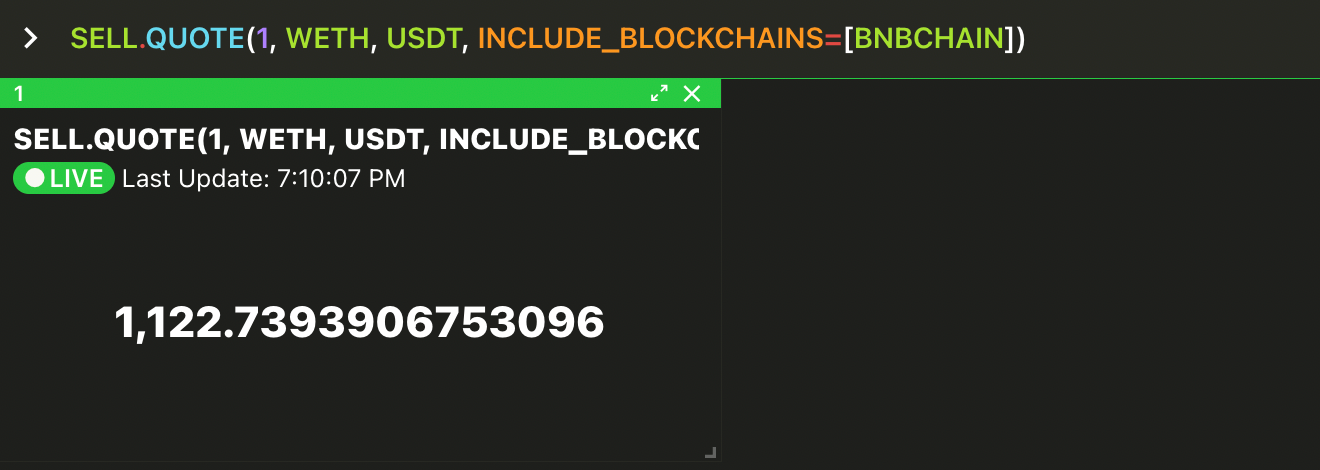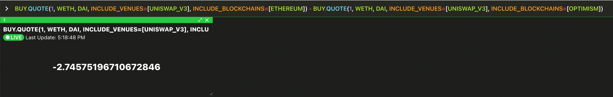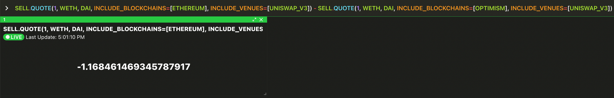 SELL.QUOTE(1, WETH, DAI, INCLUDE_BLOCKCHAINS=[ETHEREUM], INCLUDE_VENUES=[UNISWAP_V3]) - SELL.QUOTE(1, WETH, DAI, INCLUDE_BLOCKCHAINS=[OPTIMISM], INCLUDE_VENUES=[UNISWAP_V3])