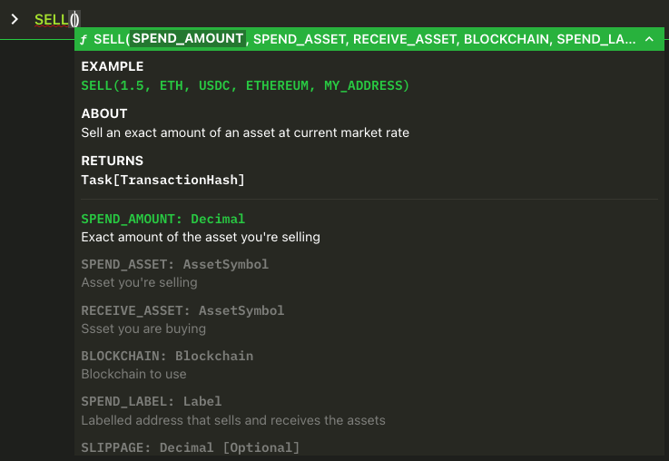 SELLfunction to sell an exact amount of an asset at the current market rate (i.e. known “spend” amount).