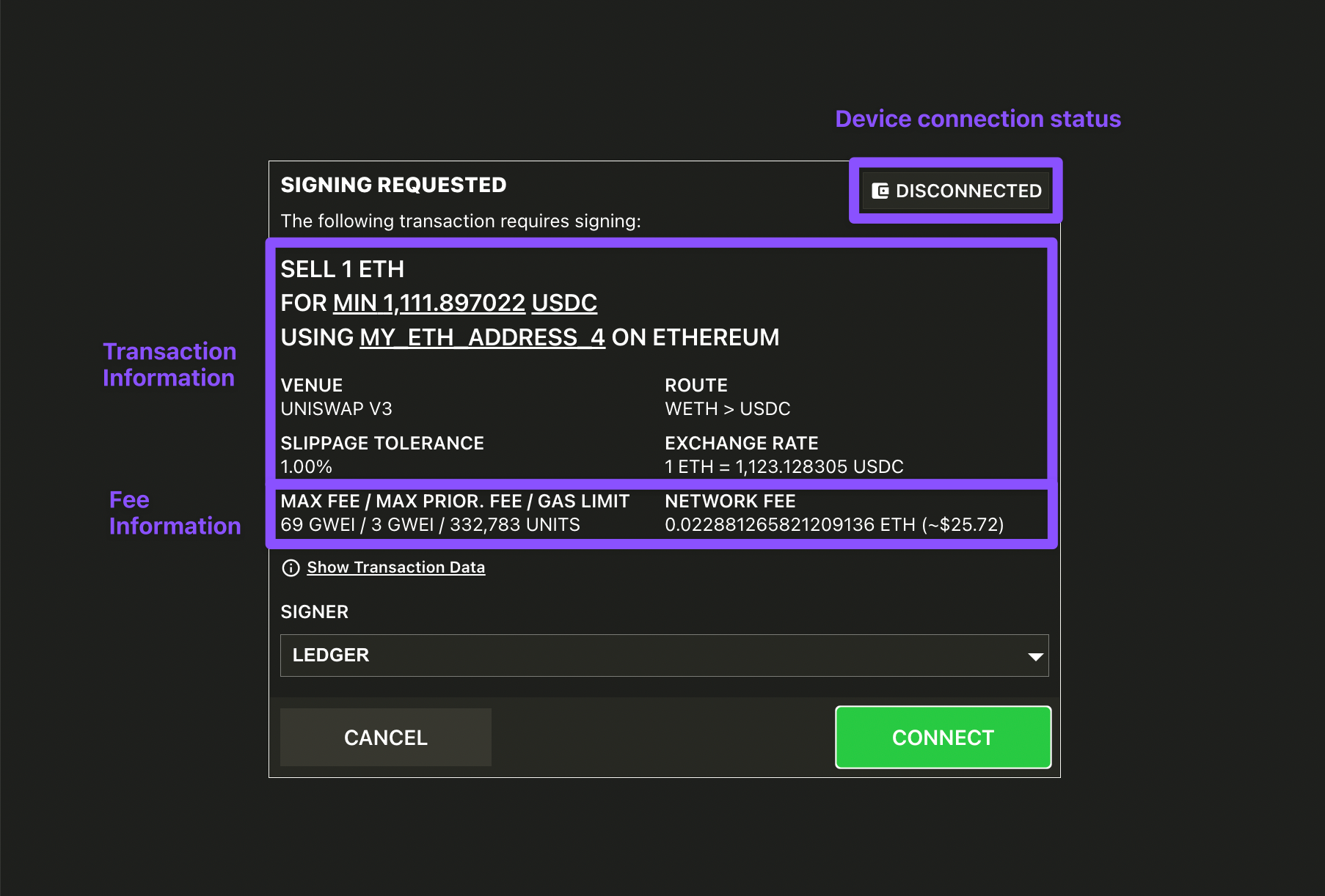 Sell exactly 1 ETH for USDC on Ethereum, using the labelled address MY_ETH_ADDRESS_4 on Ethereum (with sample Signing Request).