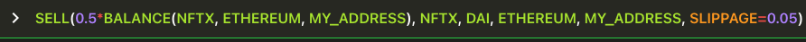Sell 50% of the total balance of NFTX held at the MY_ADDRESS on Ethereum, and receive DAI, and override default 1% slippage to set at 5%.