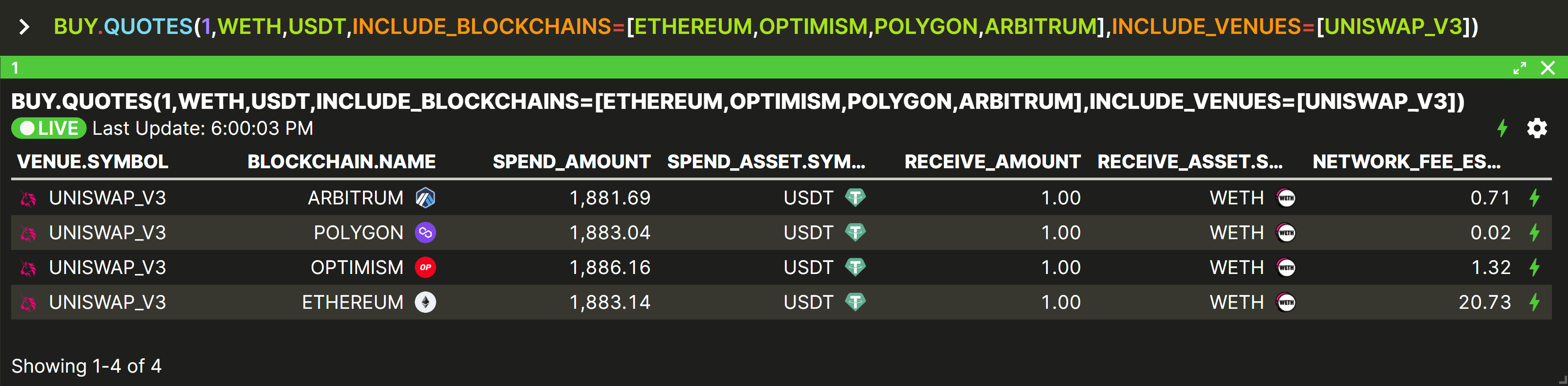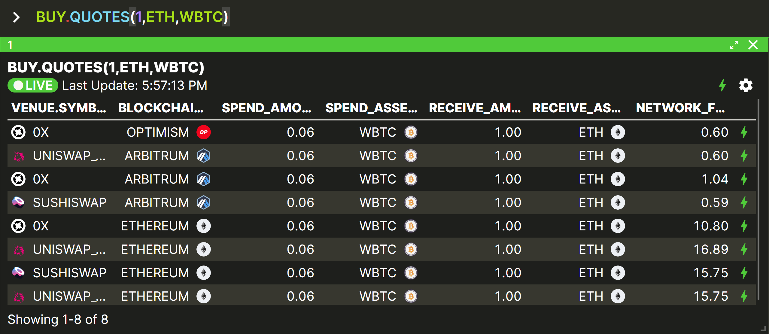 BUY.QUOTES is very similar to BUY.QUOTE except that it outputs a table showing the same quote for each supported venue on each chain, instead of just the single ‘best’ quote found on all chains.