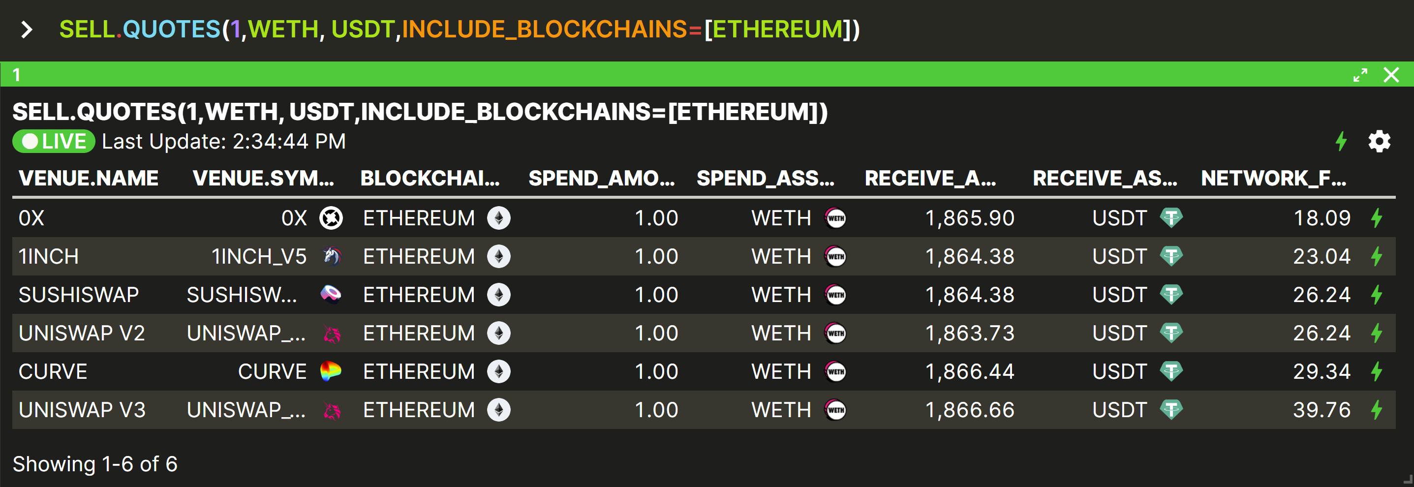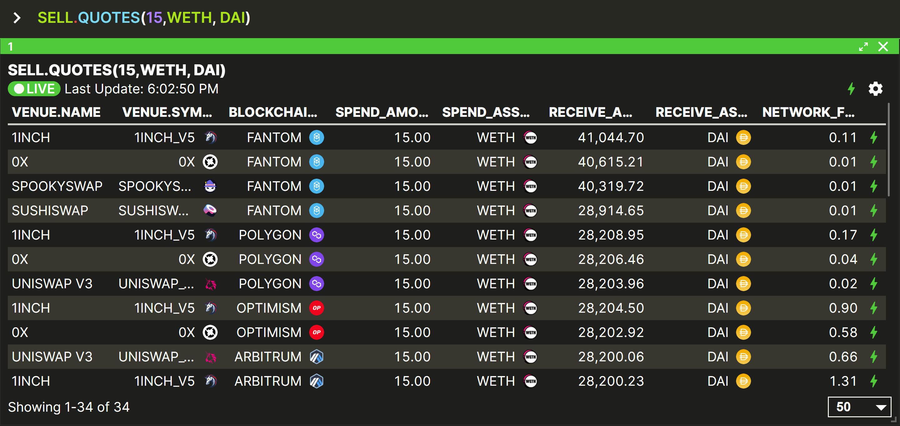 SELL.QUOTES is very similar to SELL.QUOTE except that it outputs a table showing the same quote for each supported venue on each chain, instead of just the single ‘best’ quote found on all chains.