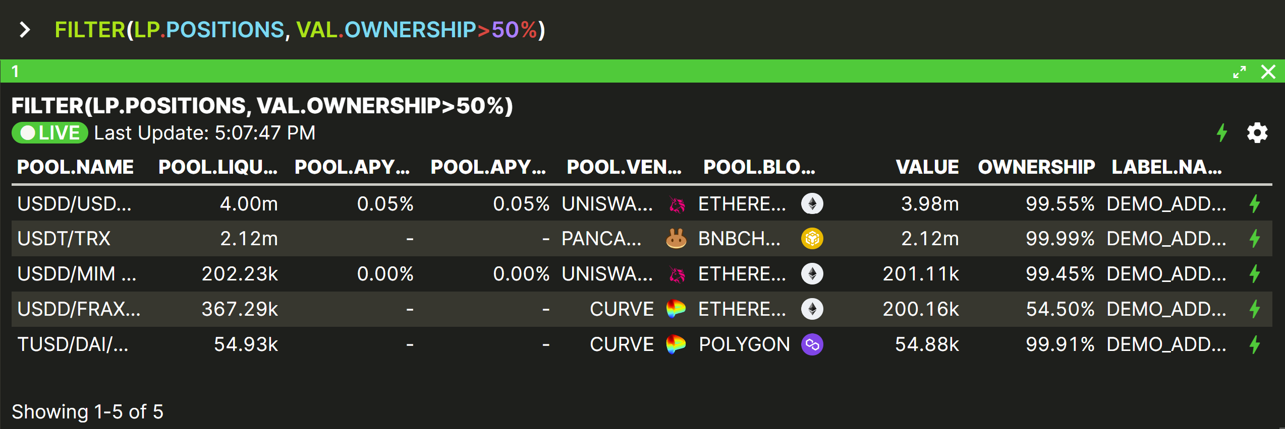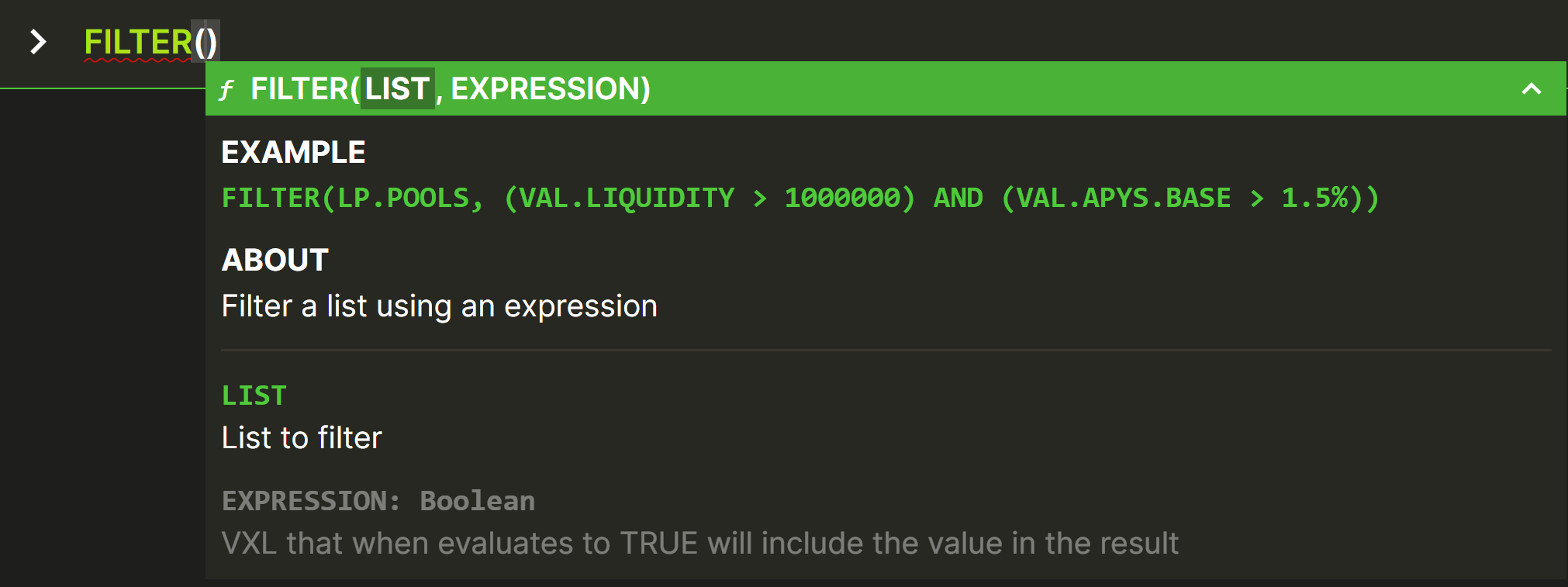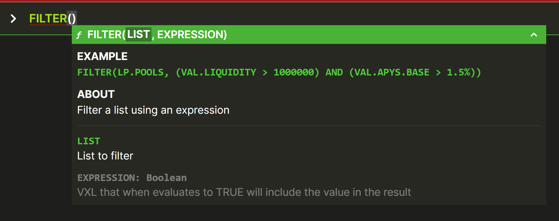 Vektor's FILTER function works with any List type in Vektor (e.g. PRICES, LP.POSITIONS, BALANCES, ASSETS, BORROW.MARKETS). You can filter on any conditional expression, giving ultimate control to find specific data using multiple parameters and combining different lists.