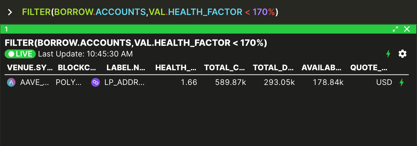 FILTER(BORROW.ACCOUNTS, VAL.HEALTH_FACTOR < 170%)