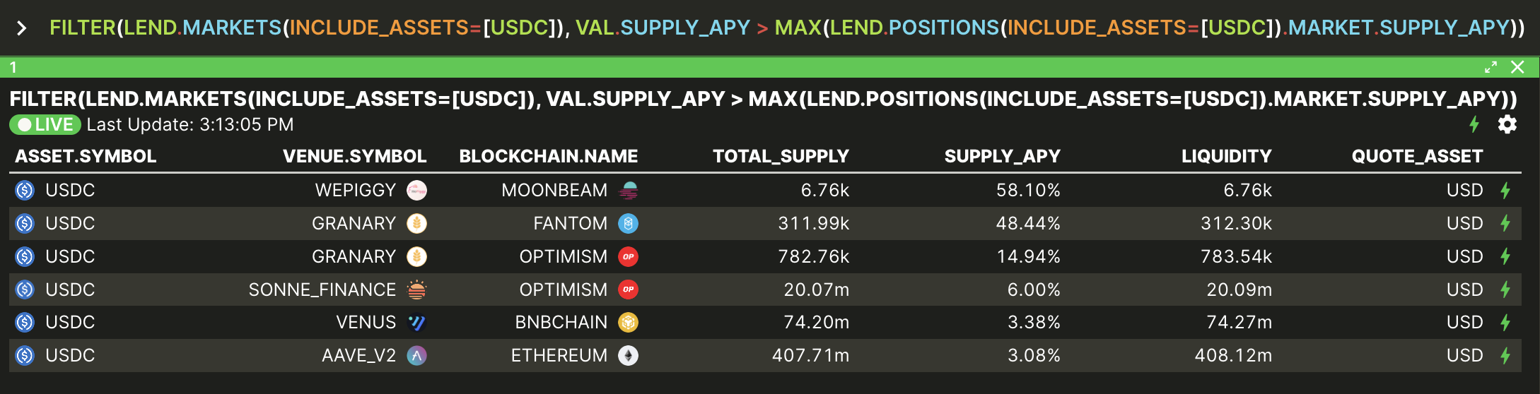 FILTER(LEND.MARKETS(INCLUDE_ASSETS=[USDC]), VAL.SUPPLY_APY > MAX(LEND.POSITIONS(INCLUDE_ASSETS=[USDC]).MARKET.SUPPLY_APY))