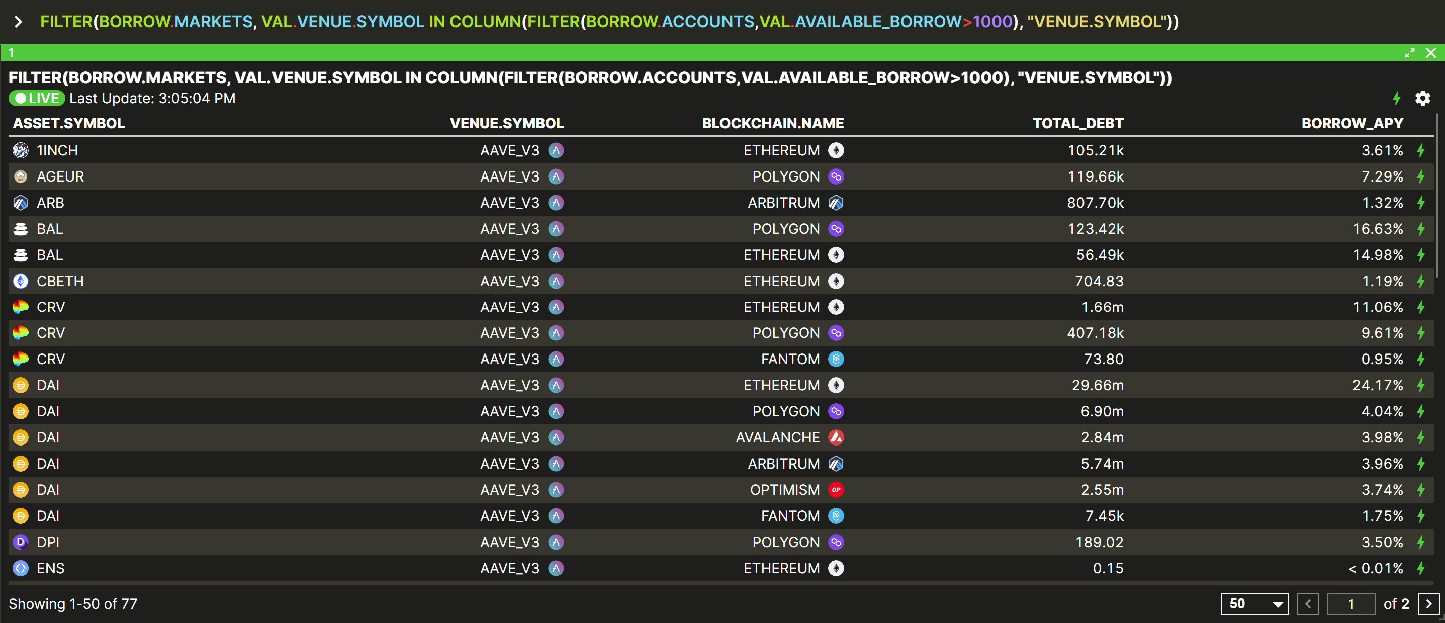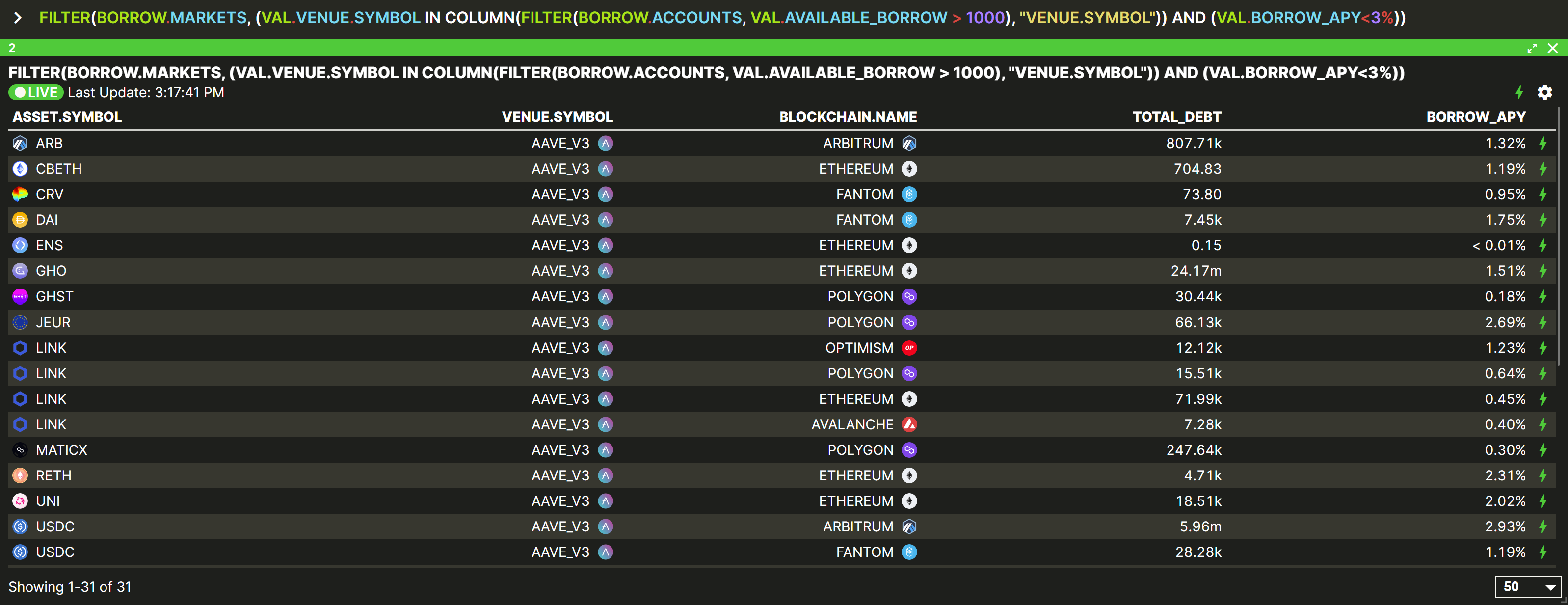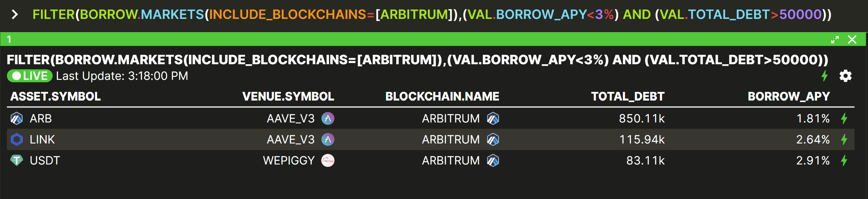 VAL on the right-hand side. VAL then lets you use the standard Vektor Data Model to access data points and perform operations on them. Vektor uses this VAL syntax to be consistent with many other languages, and to avoid problems with disambiguation.AND(...) & OR(...) to make more complicated conditions.Let's look for a Arbitrum borrow market with a borrow APY lower than 3% and a total debt value higher than 50K