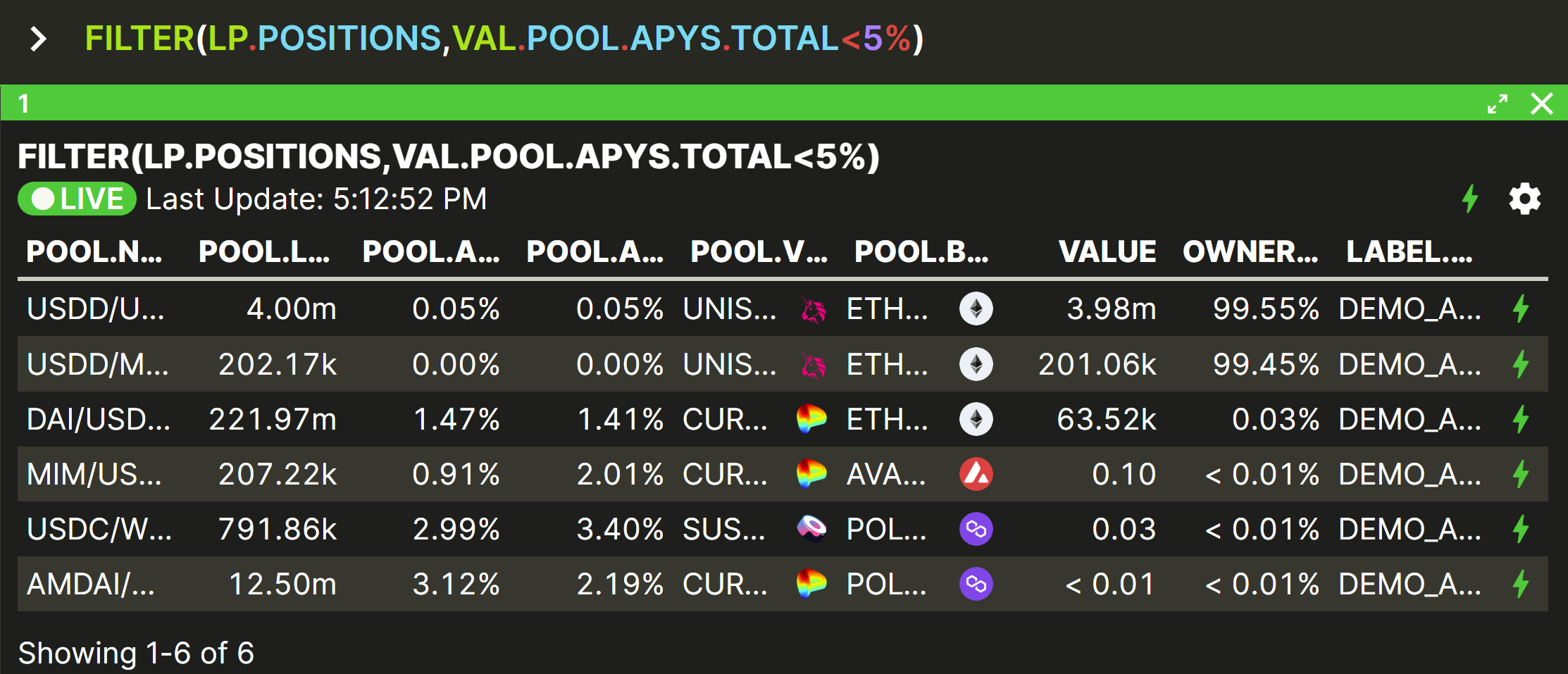 FILTER(LP.POSITIONS, VAL.POOL.APYS.TOTAL < 5%)