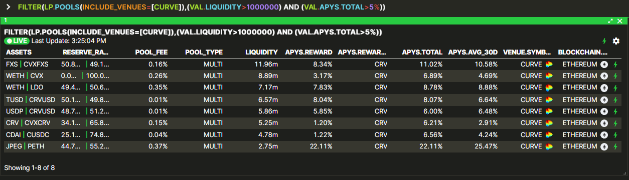 FILTER(LP.POOLS(INCLUDE_VENUES=[CURVE]), (VAL.LIQUIDITY > 1000000) AND (VAL.APYS.TOTAL > 5%))