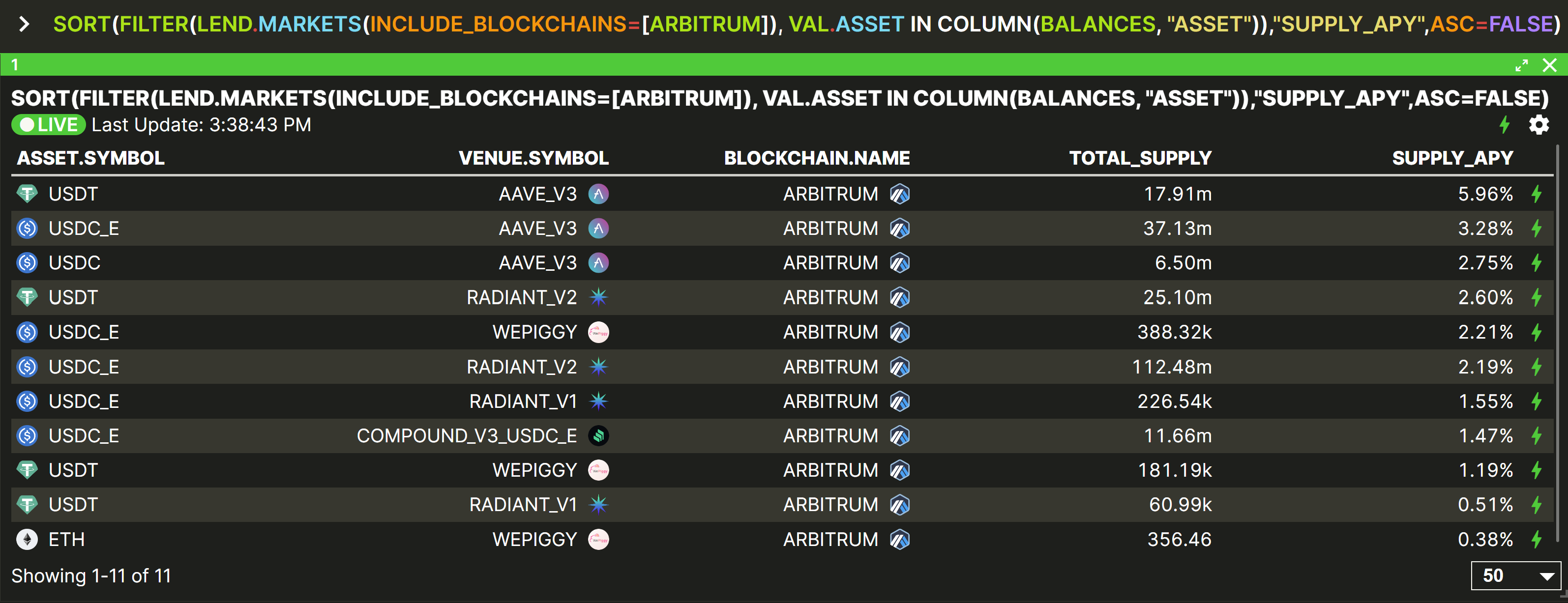 SORT(FILTER(LEND.MARKETS(INCLUDE_BLOCKCHAINS=[ARBITRUM]), VAL.ASSET IN COLUMN(BALANCES, "ASSET")), "SUPPLY_APY", ASC=FALSE)