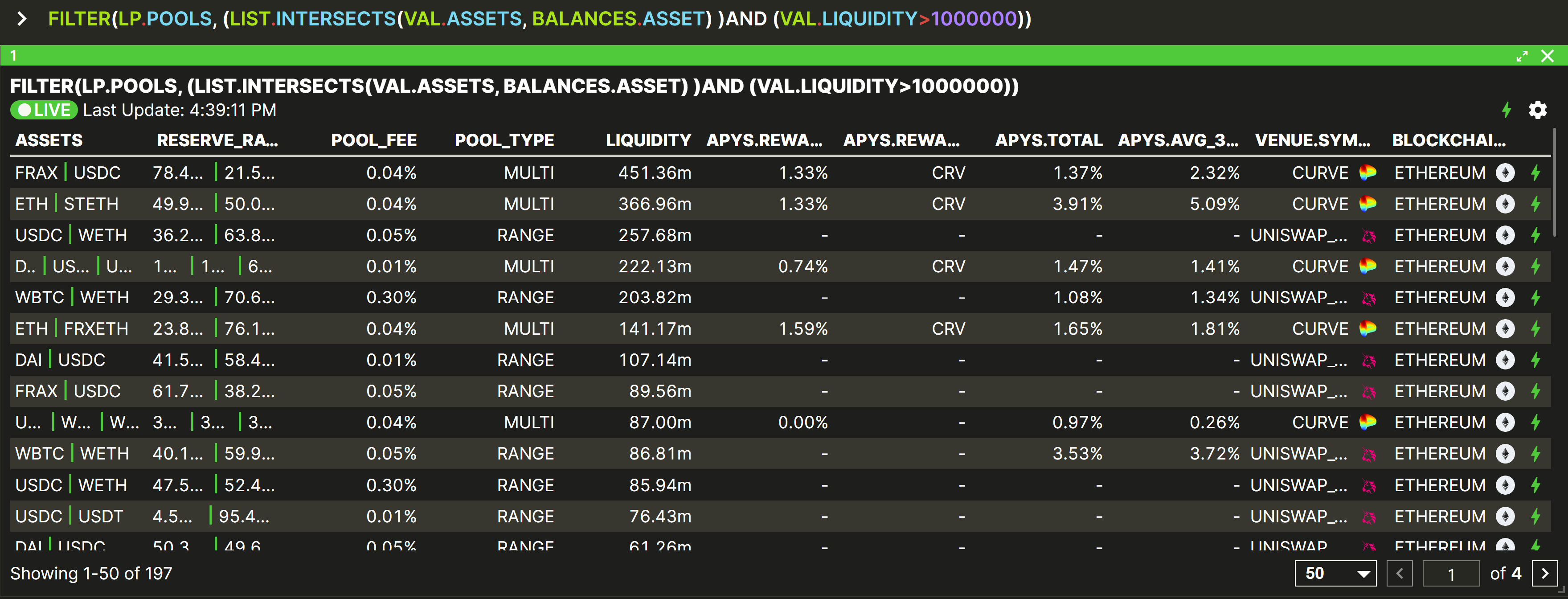 FILTER(LP.POOLS, (LIST.INTERSECTS(VAL.ASSETS, BALANCES.ASSET)) AND (VAL.LIQUIDITY > 1000000))