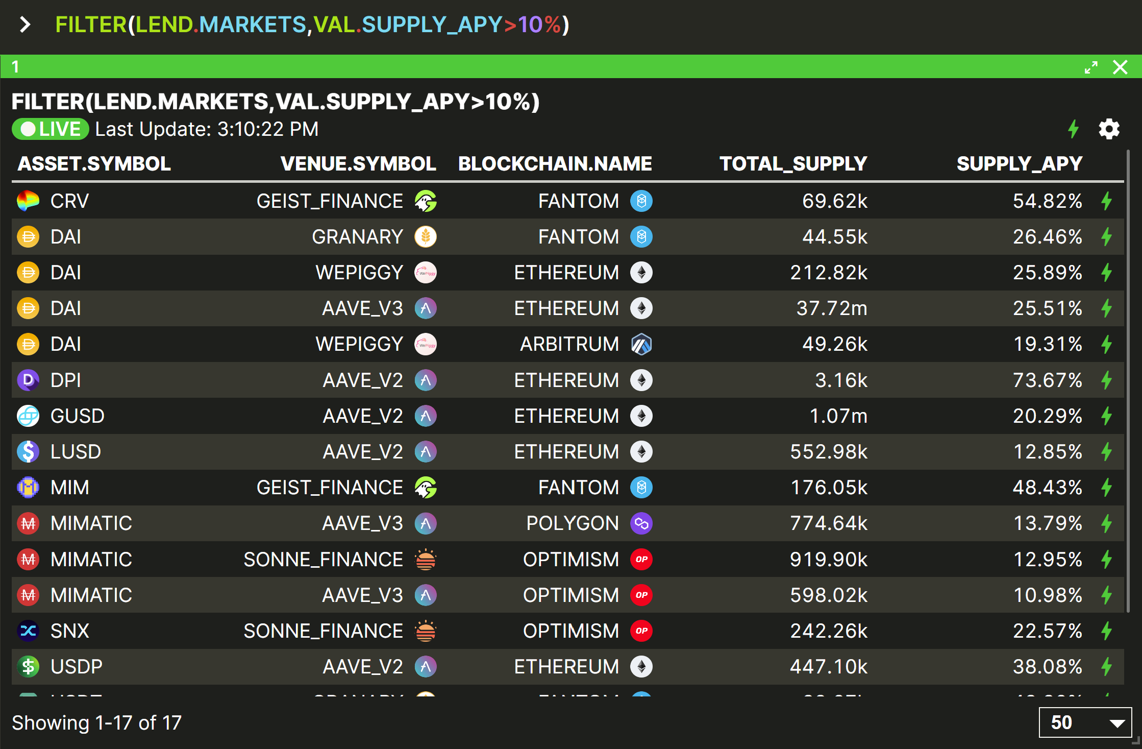 FILTER(LEND.MARKETS, VAL.SUPPLY_APY > 10%)