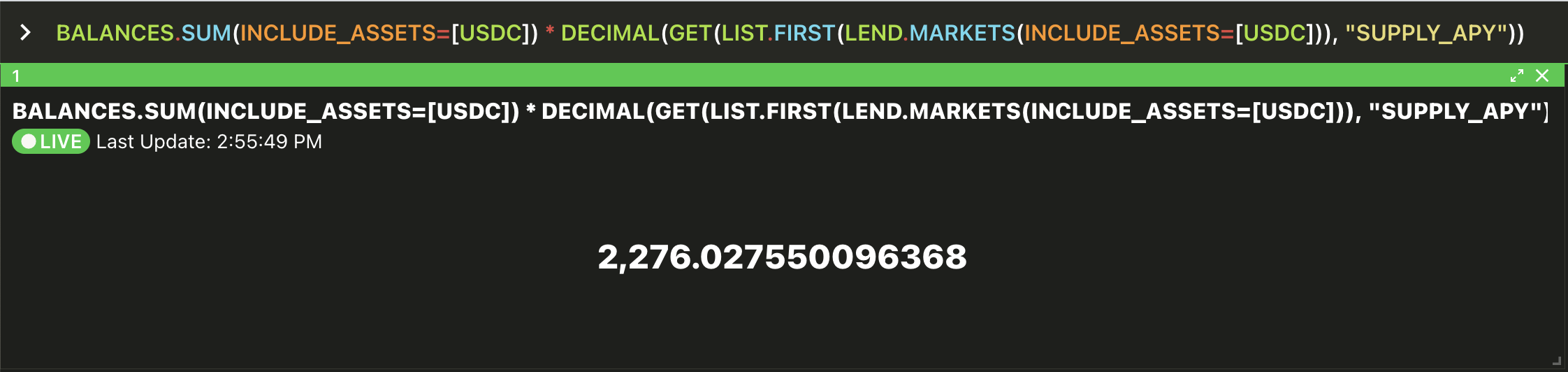 DECIMAL function to conver the SUPPLY_APY (percentage) to a decimal format for multiplication. This may change in future. Success! We now have our earnings potential forecast, fully dynamic and constantly updating to reflect changes in our USDC balances (wherever they are) and to reflect the current best lending market (whichever venue or chain it occurs).