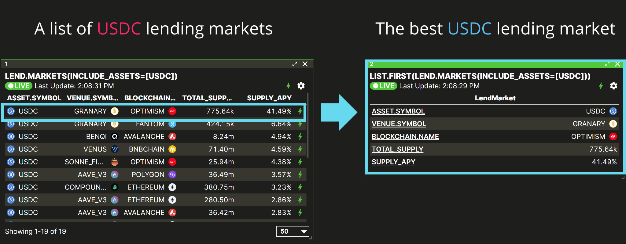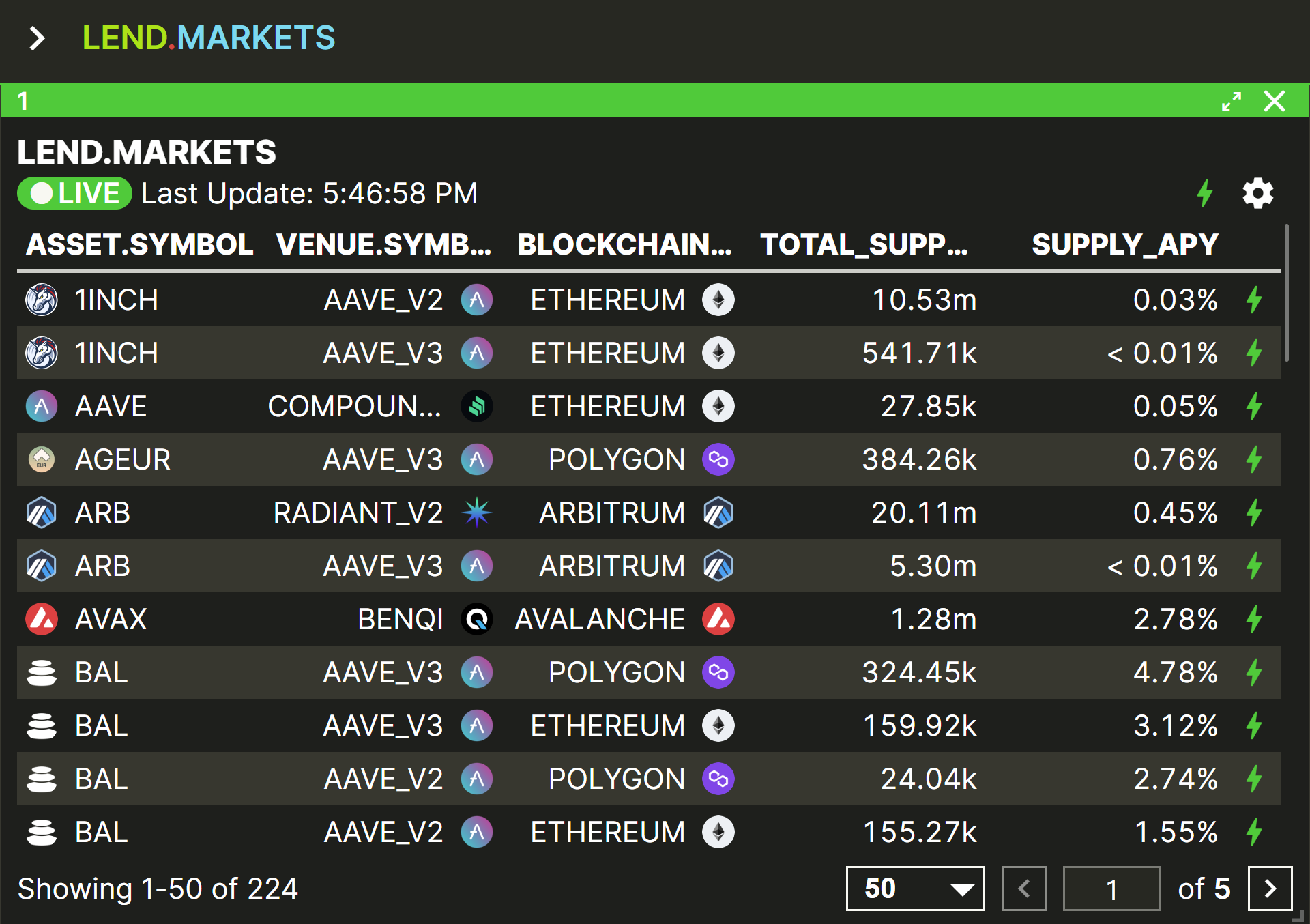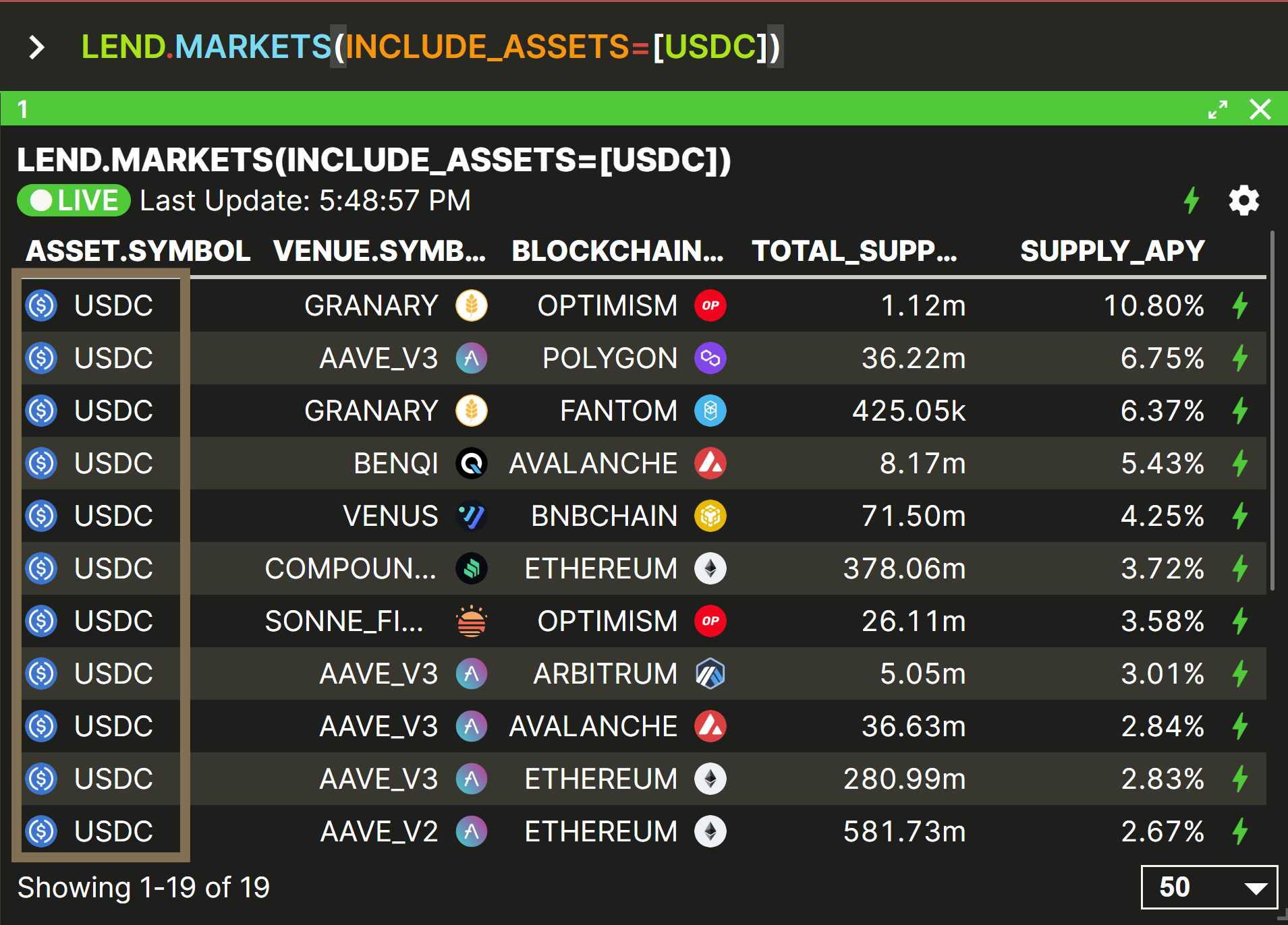 Use the LEND.MARKETS function to instantly see all the supply APYs on all supported assets, venues, and blockchains, all in one list and live updating every few seconds.