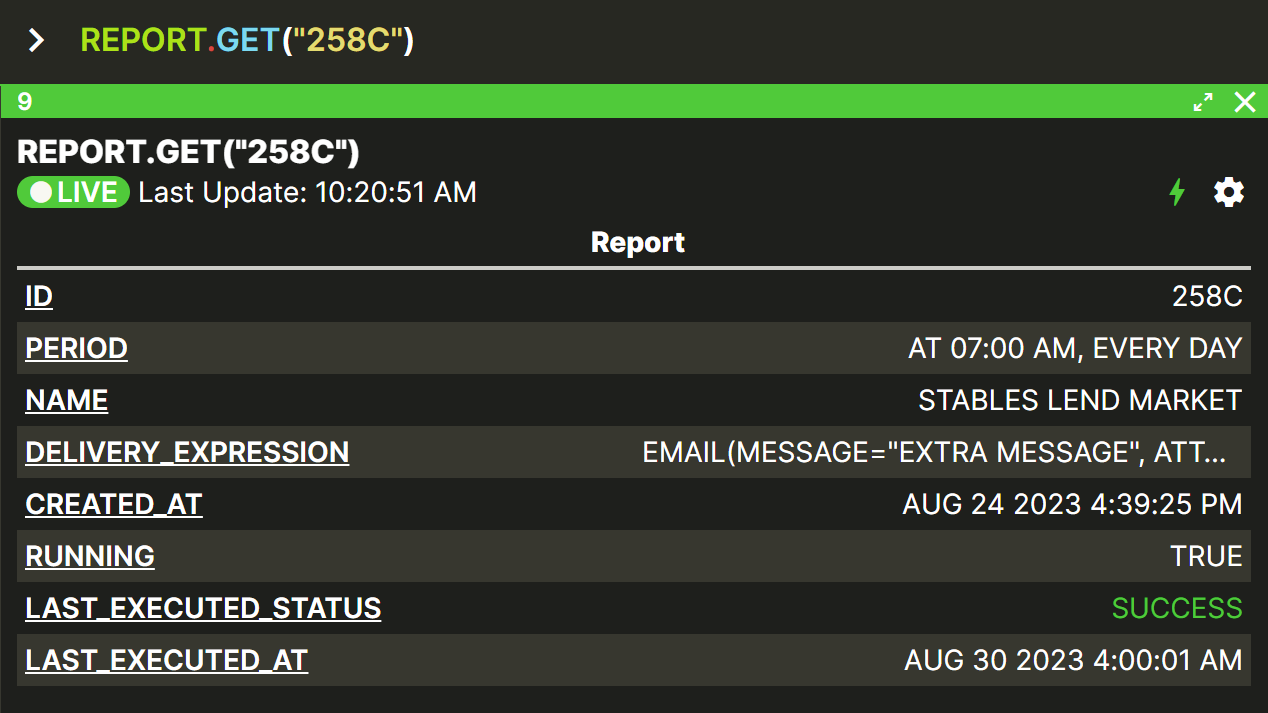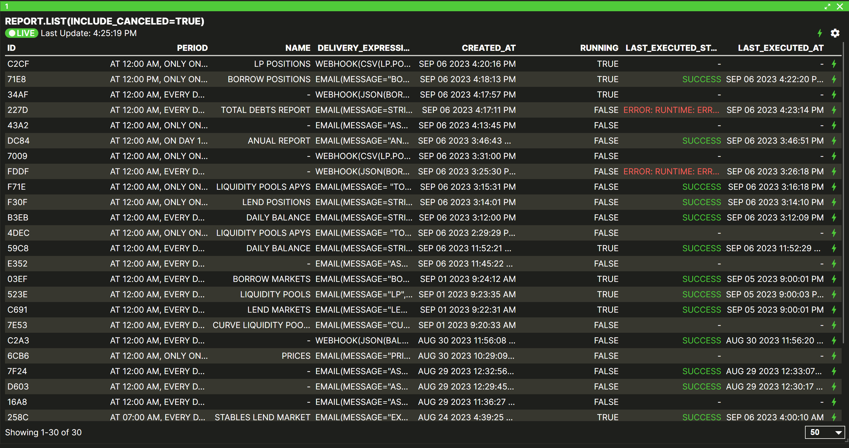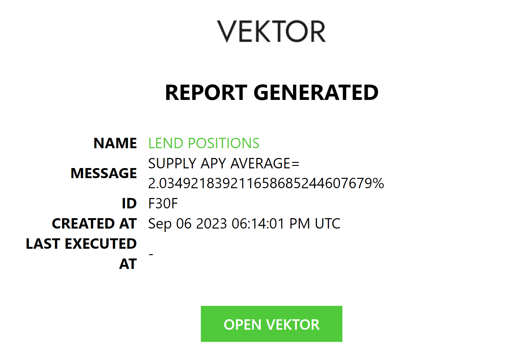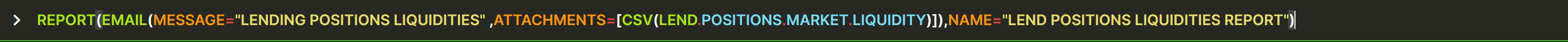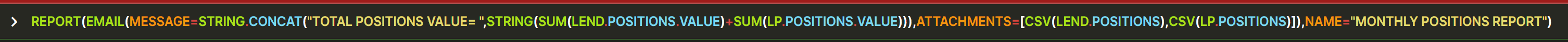 REPORT.WEEKLY(EMAIL(MESSAGE=STRING.CONCAT("Supply APY Average= ",STRING(AVERAGE(LEND.POSITIONS.MARKET.SUPPLY_APY))), ATTACHMENTS=[CSV(LEND.POSITIONS)]),NAME="LEND POSITIONS")