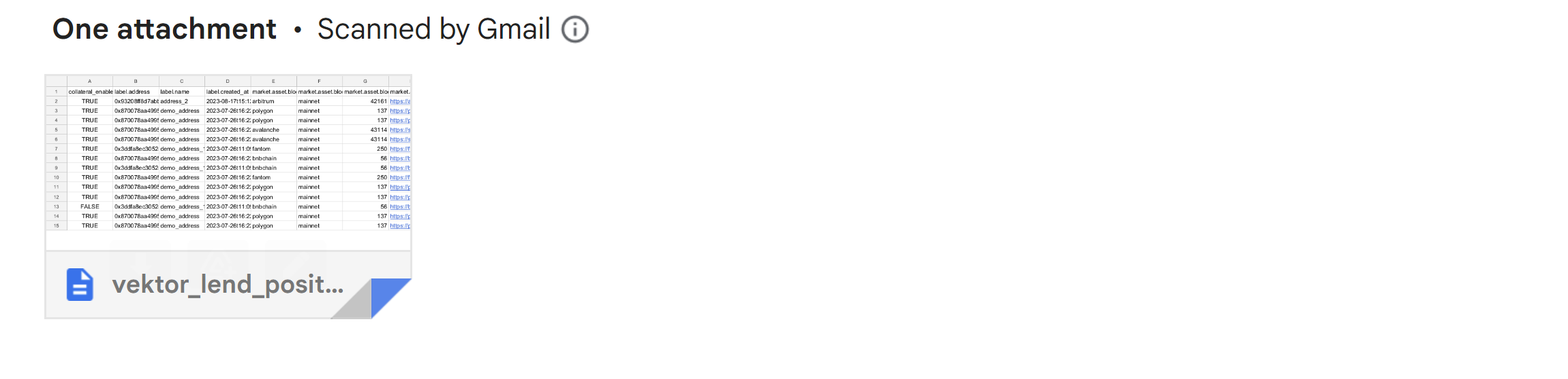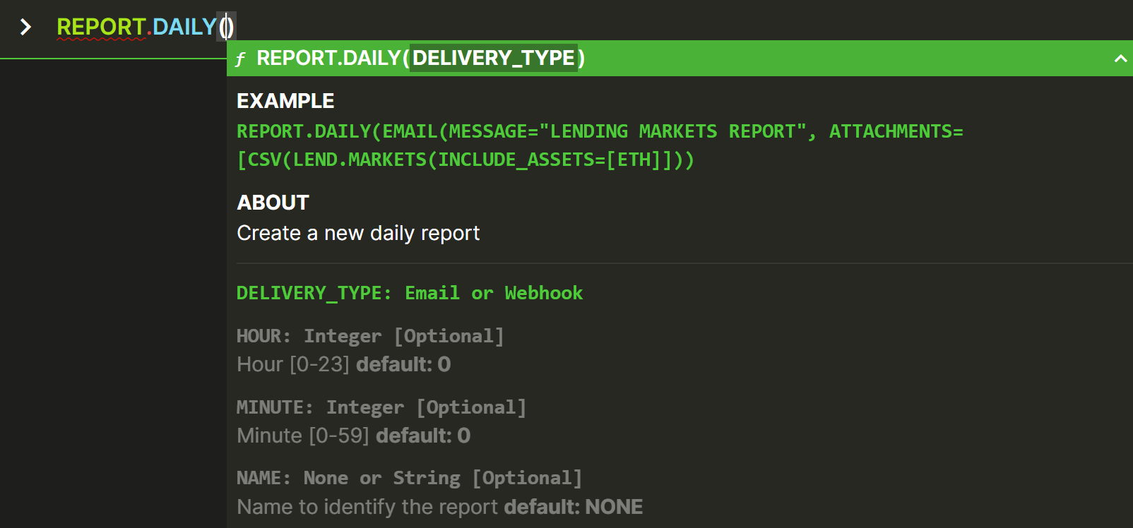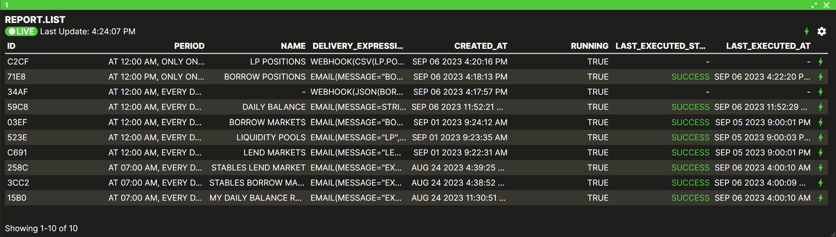 REPORT.WEEKLY(EMAIL(MESSAGE=STRING.CONCAT("Supply APY Average= ",STRING(AVERAGE(LEND.POSITIONS.MARKET.SUPPLY_APY))), ATTACHMENTS=[CSV(LEND.POSITIONS)]),NAME="LEND POSITIONS")