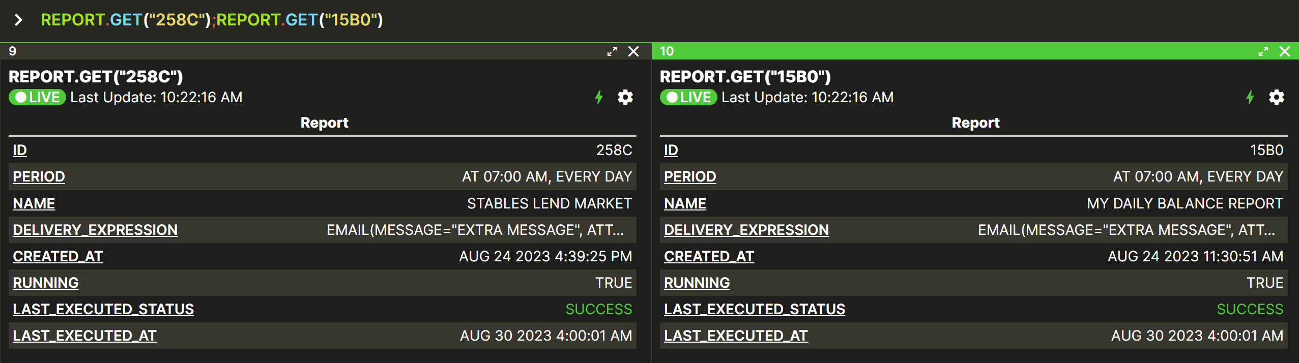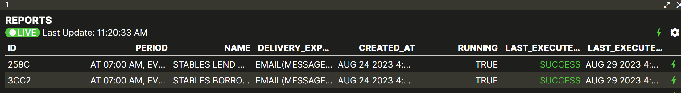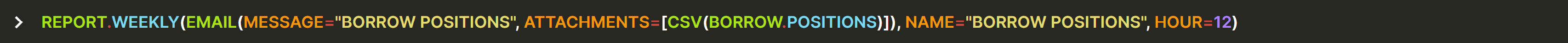 REPORT.WEEKLY(EMAIL(MESSAGE="BORROW POSITIONS", ATTACHMENTS=[CSV(BORROW.POSITIONS)]), NAME="BORROW POSITIONS", HOUR=12)