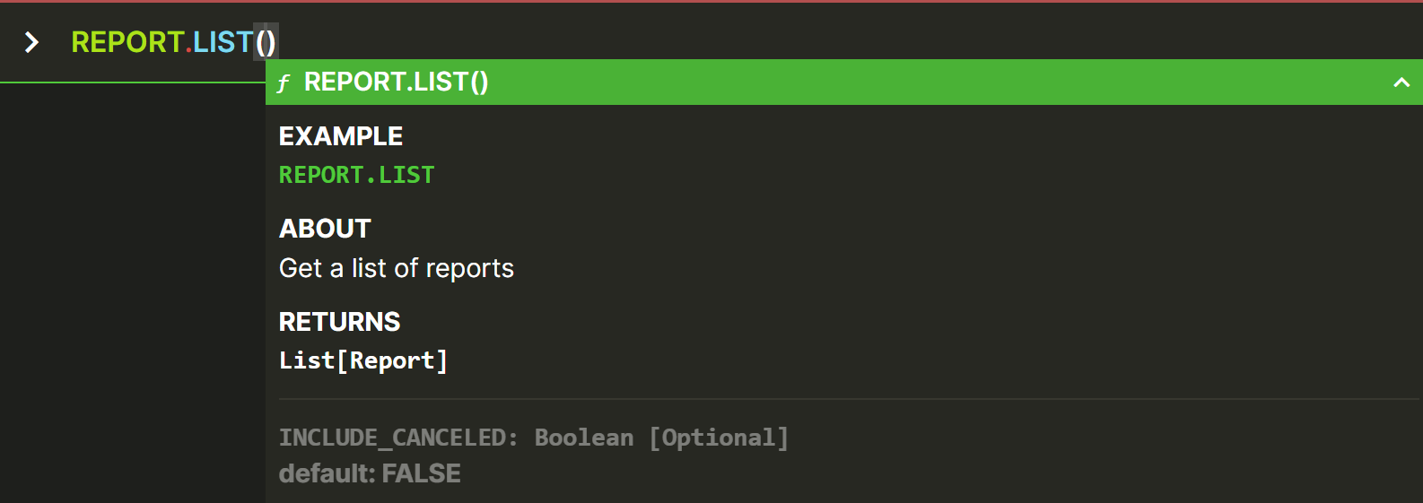 To see a list of reports and their id's, you can use the REPORT.LIST function covered in the previous section.