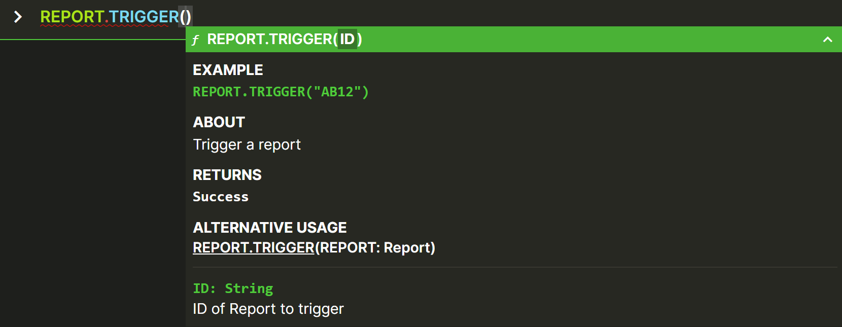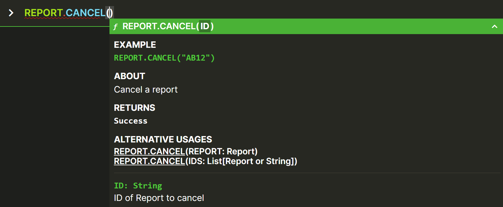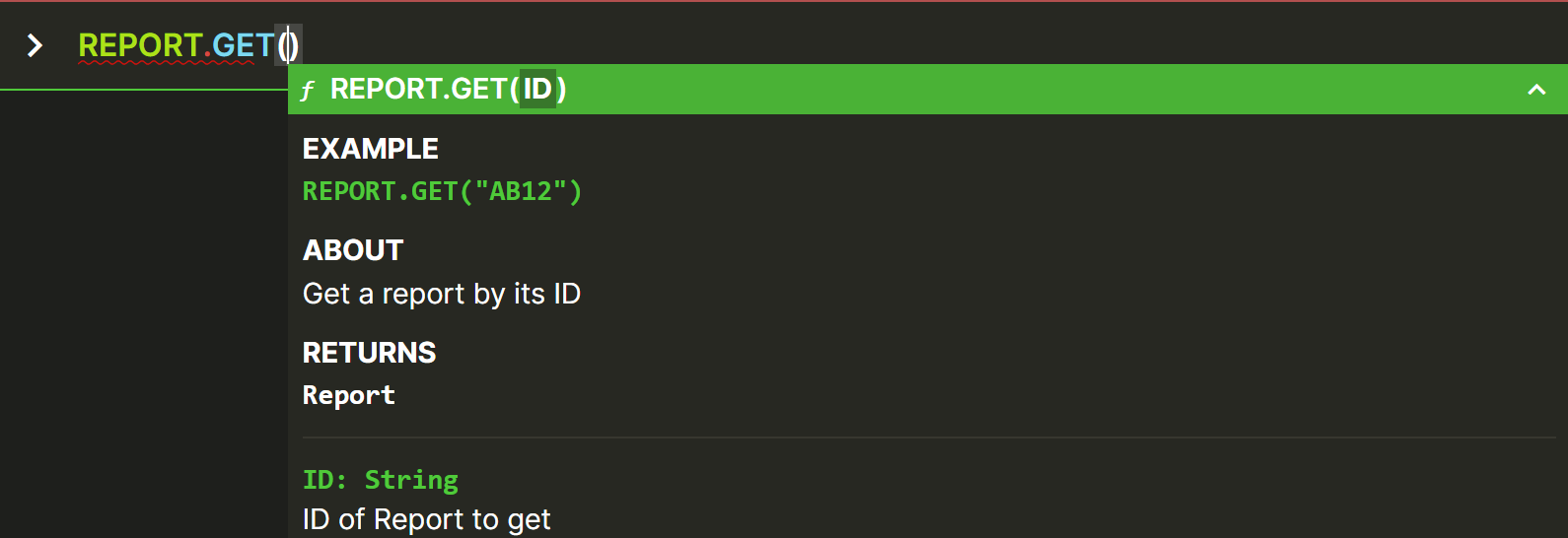 id to the REPORT.GET function in quotation marks e.g. REPORT.GET("AB12")REPORT.GET(...) Examples
