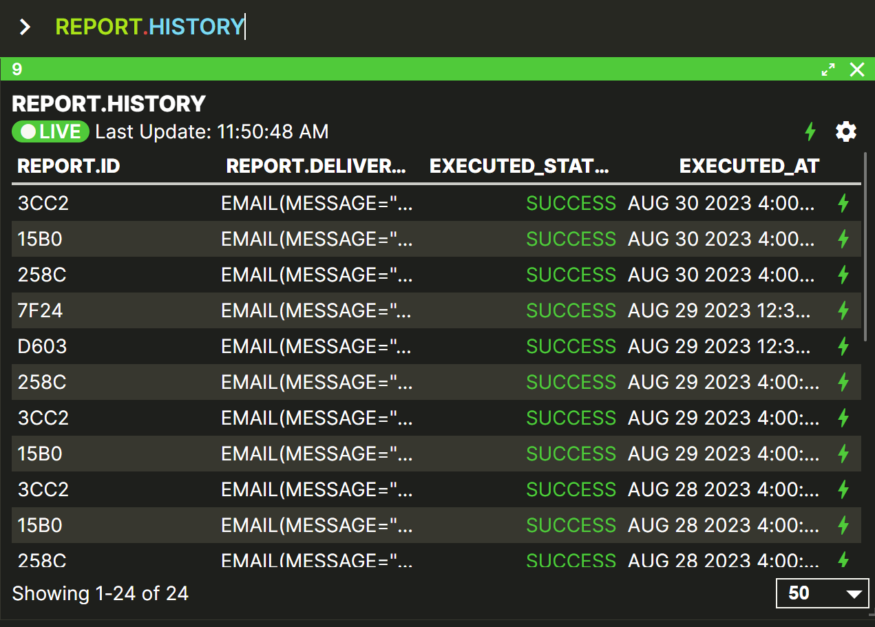 To visualize the history of reports executions you can use the REPORT.HISTORY function. This will tell you all the instances of the report deliveries and when they were executed.