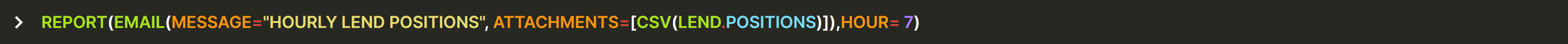 REPORT(EMAIL(MESSAGE="HOURLY LEND POSITIONS", ATTACHMENTS=[CSV(LEND.POSITIONS)]), HOUR=7)