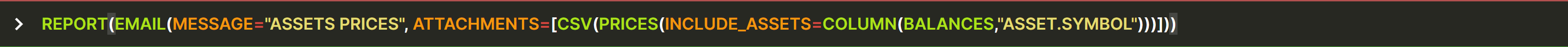 REPORT(EMAIL(MESSAGE="ASSETS PRICES", ATTACHMENTS=[CSV(PRICES(INCLUDE_ASSETS=COLUMN(BALANCES,"ASSET.SYMBOL")))]))
