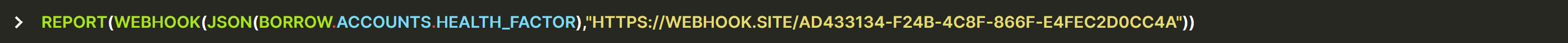 REPORT(WEBHOOK(JSON(BORROW.ACCOUNTS.HEALTH_FACTOR),"HTTPS://WEBHOOK.SITE/AD433134-F24B-4C8F-866F-E4FEC2D0CC4A"))