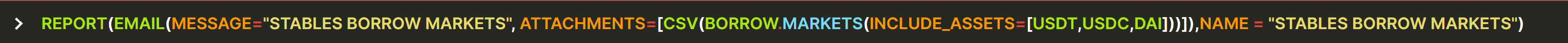 REPORT(EMAIL(MESSAGE="STABLES BORROW MARKETS", ATTACHMENTS=[CSV(BORROW.MARKETS(INCLUDE_ASSETS=[USDT,USDC,DAI]))]),NAME="STABLES BORROW MARKETS")