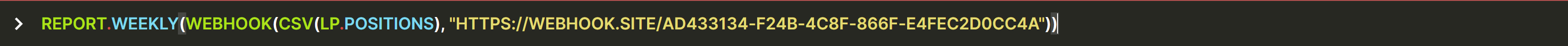 REPORT.WEEKLY(WEBHOOK(CSV(LP.POSITIONS),"HTTPS://WEBHOOK.SITE/AD433134-F24B-4C8F-866F-E4FEC2D0CC4A"), NAME="LP POSITIONS")
