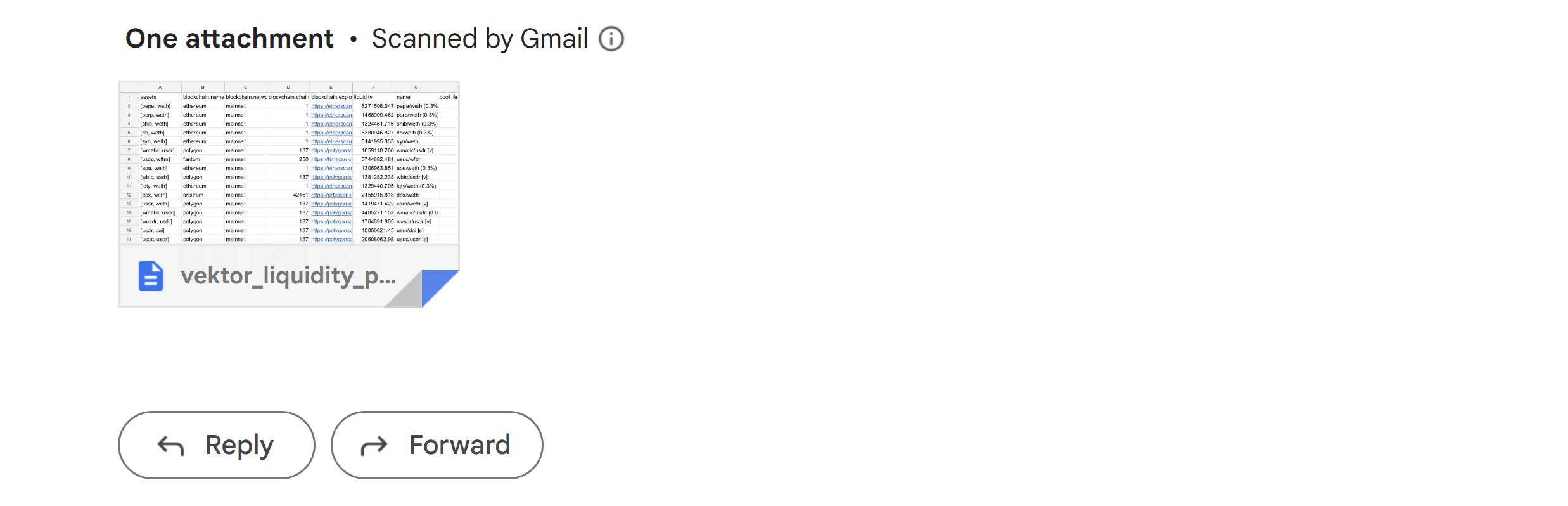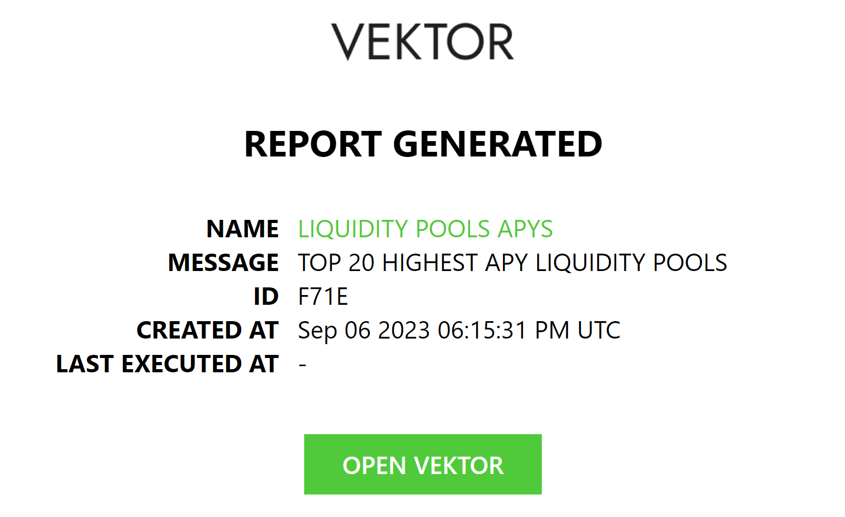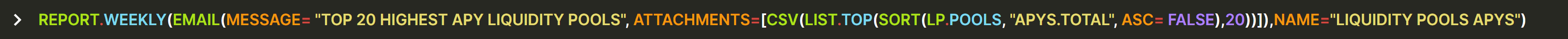 REPORT.WEEKLY(EMAIL(MESSAGE= "TOP 20 HIGHEST APY LIQUIDITY POOLS", ATTACHMENTS=[CSV(LIST.TOP(SORT(FILTER(LP.POOLS,VAL.LIQUIDITY > 1_000_000), "APYS.TOTAL", ASC= FALSE),20))]),NAME="LIQUIDITY POOLS APYS")