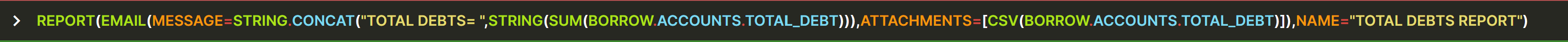 REPORT(EMAIL(MESSAGE=STRING.CONCAT("TOTAL DEBTS= ",STRING(SUM(BORROW.ACCOUNTS.TOTAL_DEBT))),ATTACHMENTS=[CSV(BORROW.ACCOUNTS.TOTAL_DEBT)]),NAME="TOTAL DEBTS REPORT")