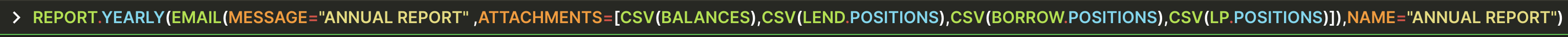 REPORT.YEARLY(EMAIL(MESSAGE="ANNUAL REPORT" ,ATTACHMENTS=[CSV(BALANCES),CSV(LEND.POSITIONS),CSV(BORROW.POSITIONS),CSV(LP.POSITIONS)]),NAME="ANNUAL REPORT")