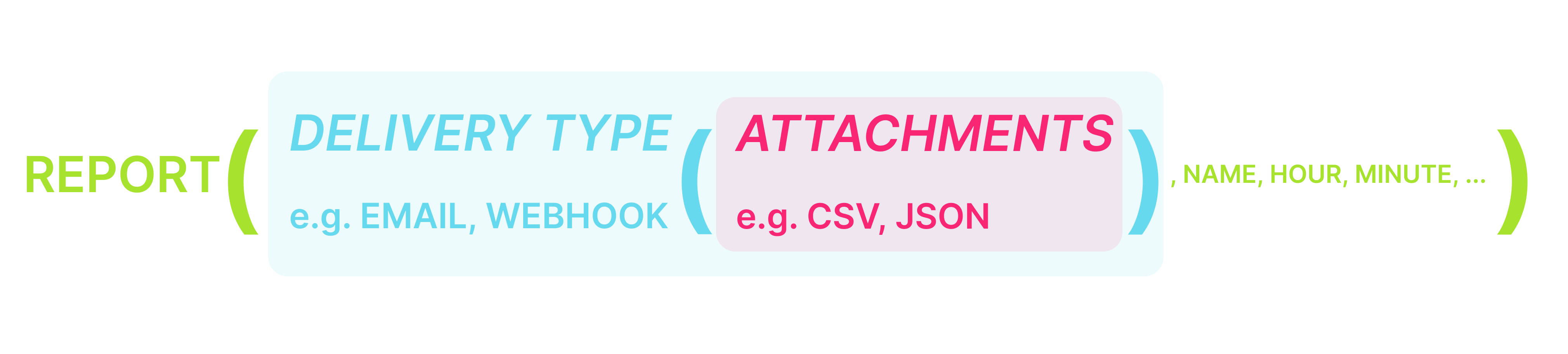 Use REPORT. to set up a new report and then choose the period of the reporting. After that, you have to introduce the delivery type (Email/Webhook) and then the format data of the report (CSV/JSON).