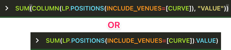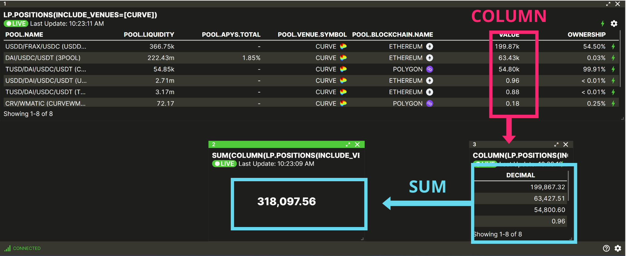 Vektor's COLUMN function can be used to extract any column from any table or list that you get from other functions. In this example, we use LP.POSITIONS (filitered on the Curve venue) to first fetch our Curve positions (on all chains). Then we wrap it in COLUMN to pull out the USD 'VALUE' data points (alternatively use the dot accessor), and finally SUM to get our total TVL. Magic! πͺ