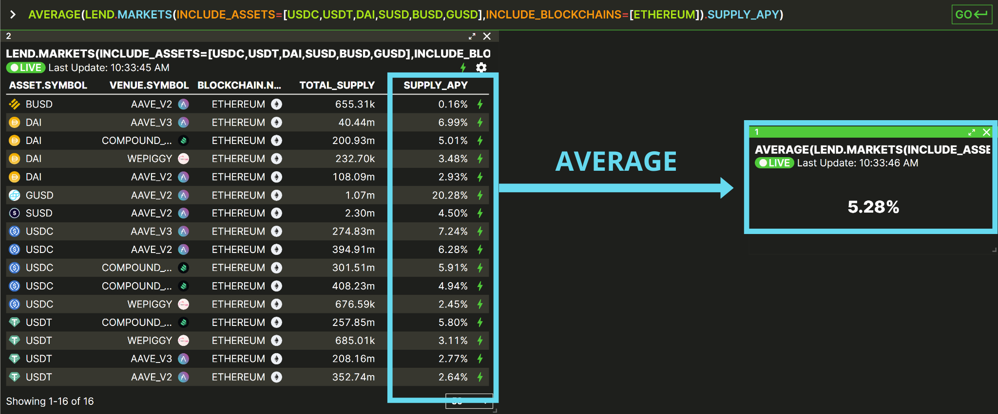 This time, we start with the LEND.βMARKETS function which by default queries the supply APYs for all assets, on all venues, on all blockchains. We use an asset filter to only include a basket of stablecoin symbols, and a blockchain filter to focus on just Ethereum. Then we extract the SUPPLY_APY column, and finally AVERAGE it to get a useful basket APY metric!