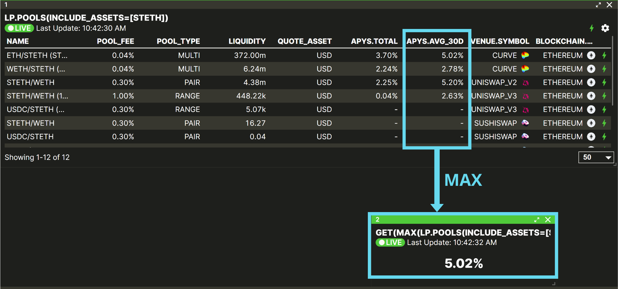 In this final example, we just want to know which pool to deposit our stETH into for the best APY. We start with the LP.POOLS function, filtered just to show pools that include stETH as a consituent asset. Then we access the 30-day Average APY column, and finally use the MAX function to tell us the best APY!