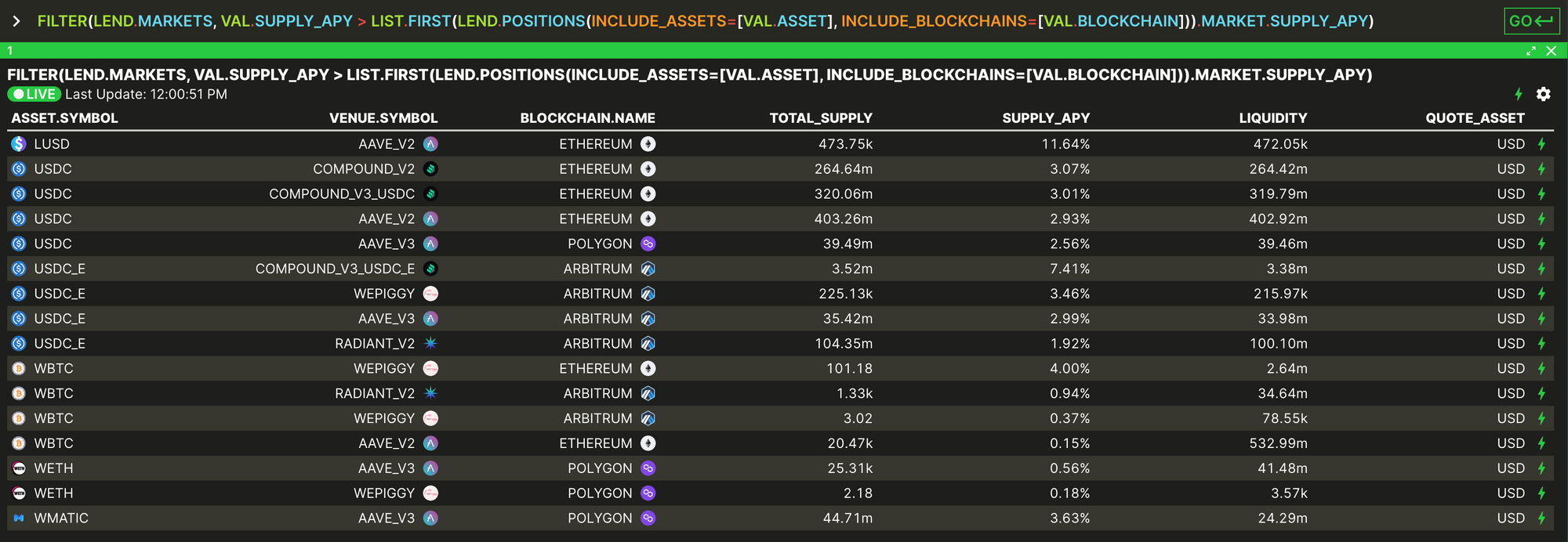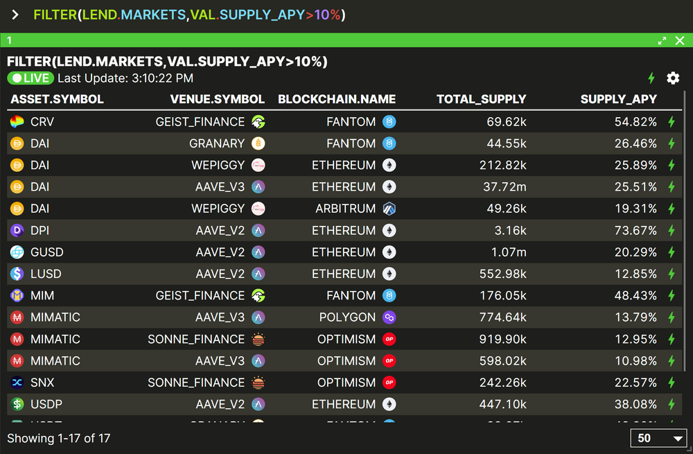 This is an exampls of using FILTER to discover the best market opportunities. We want to show all the lending markets with APY higher than 10%. So we filter on LEND.MARKETS with the condition being SUPPLY_APY > 10%.