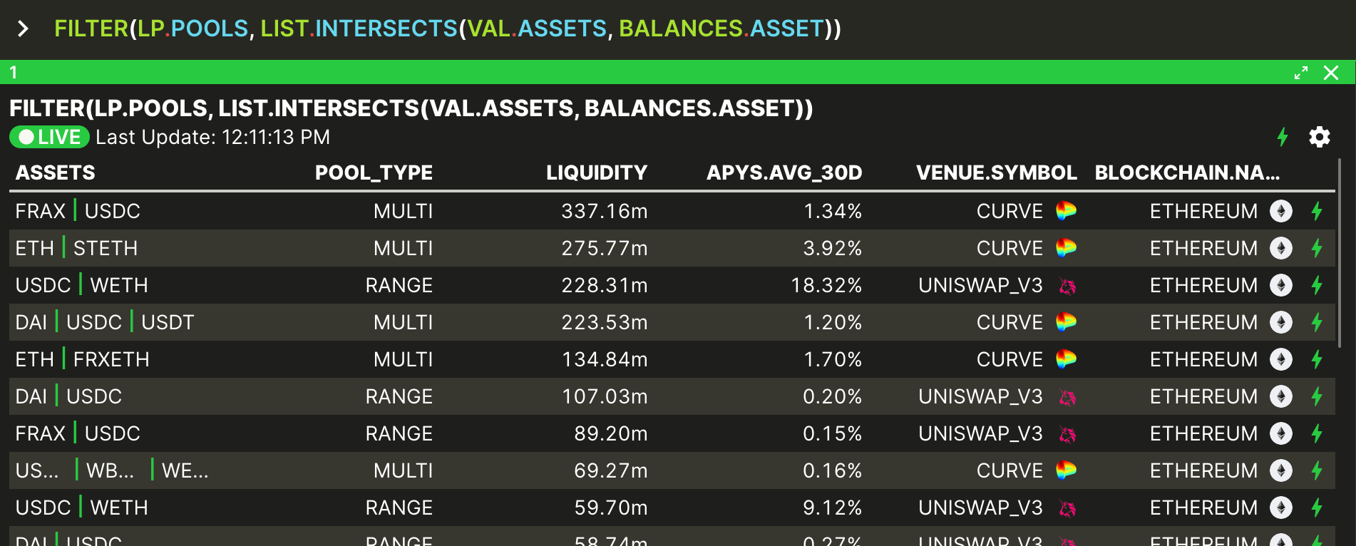 This is an exampls of using FILTER to identify wasted opportunities. We want to show all the liquidity pools that I can already deposit into with existing assets in my portfolio. So we take the LP.POOLS function and filter it to see where the pool assets intersect with the assets in my spot BALANCES.