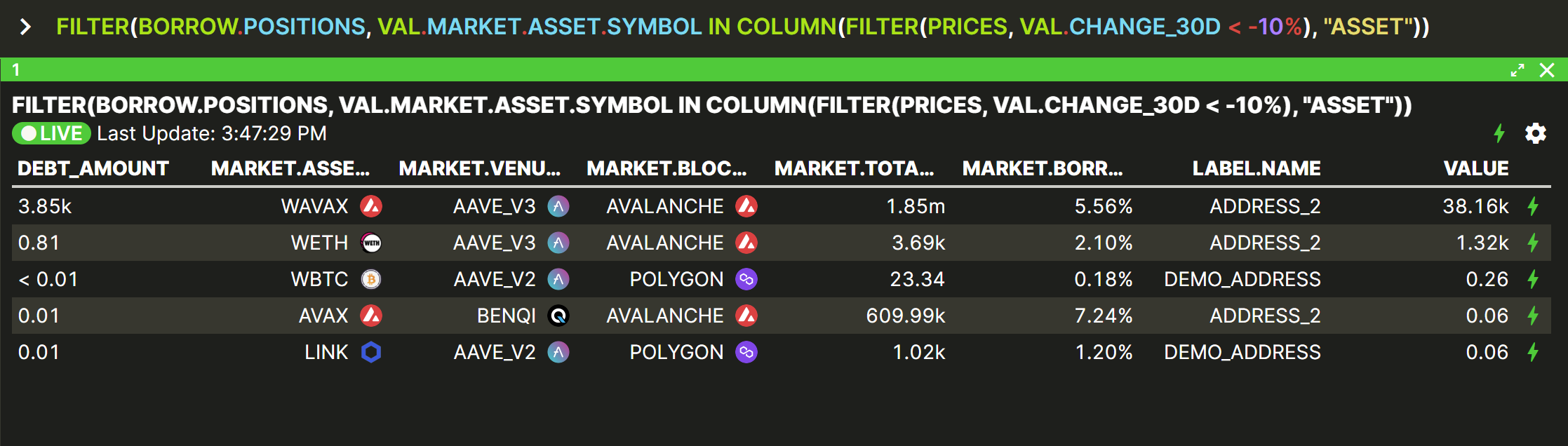 This is an exampls of using FILTER to prevent high-risk situations. We want to get my borrow positions where the price of the borrowed assets is down more than 10% in 30 days. So we take our BORROW.POSITIONS list and filter it to match assets that remain in a filtered version of the PRICES table. So it's a filter inside a filter.