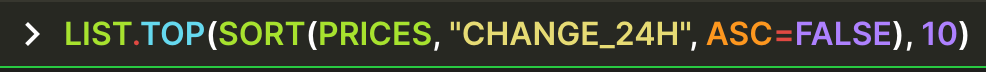 First, use the Vektor app to visualize the data you want to see in the report. In this example we will use a combination of PRICES, SORT, and LIST.TOP to get the top 10 assets sorted by price: