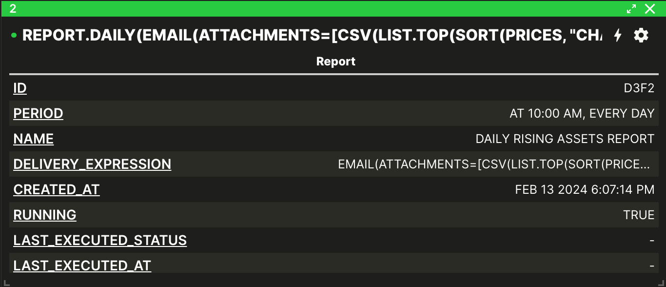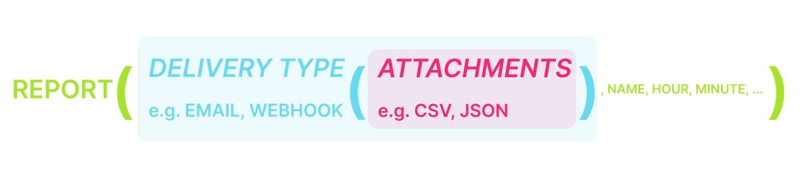To set up a periodic report, we simply wrap the REPORT function around our previous expression. Now we can have this output delivered on a scheduled basis, automatically, with a number of configurable options: