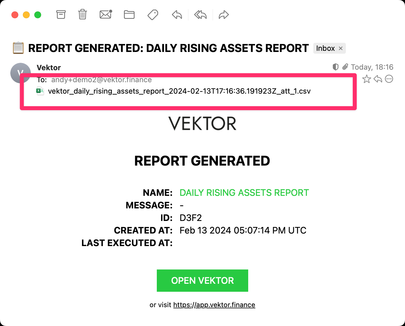 This is just one of a huge number of examples we could show you of how to use the REPORT function. As always with Vektor, we like to give users the power to create their own bespoke use cases. We hope you'll play around and try using Vektor with Webhooks, multiple attachments, or even dynamic 'mail merge' message text. You can read all about these functionalities in our detailed REPORT documentation.