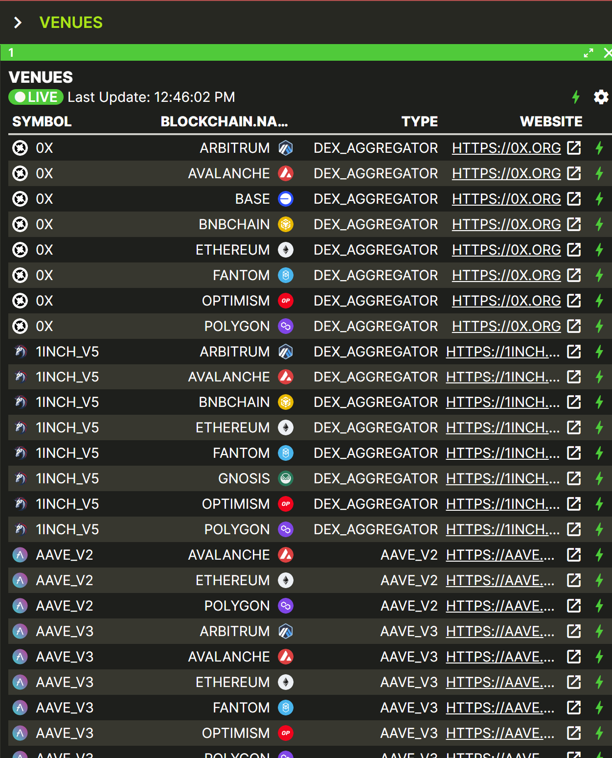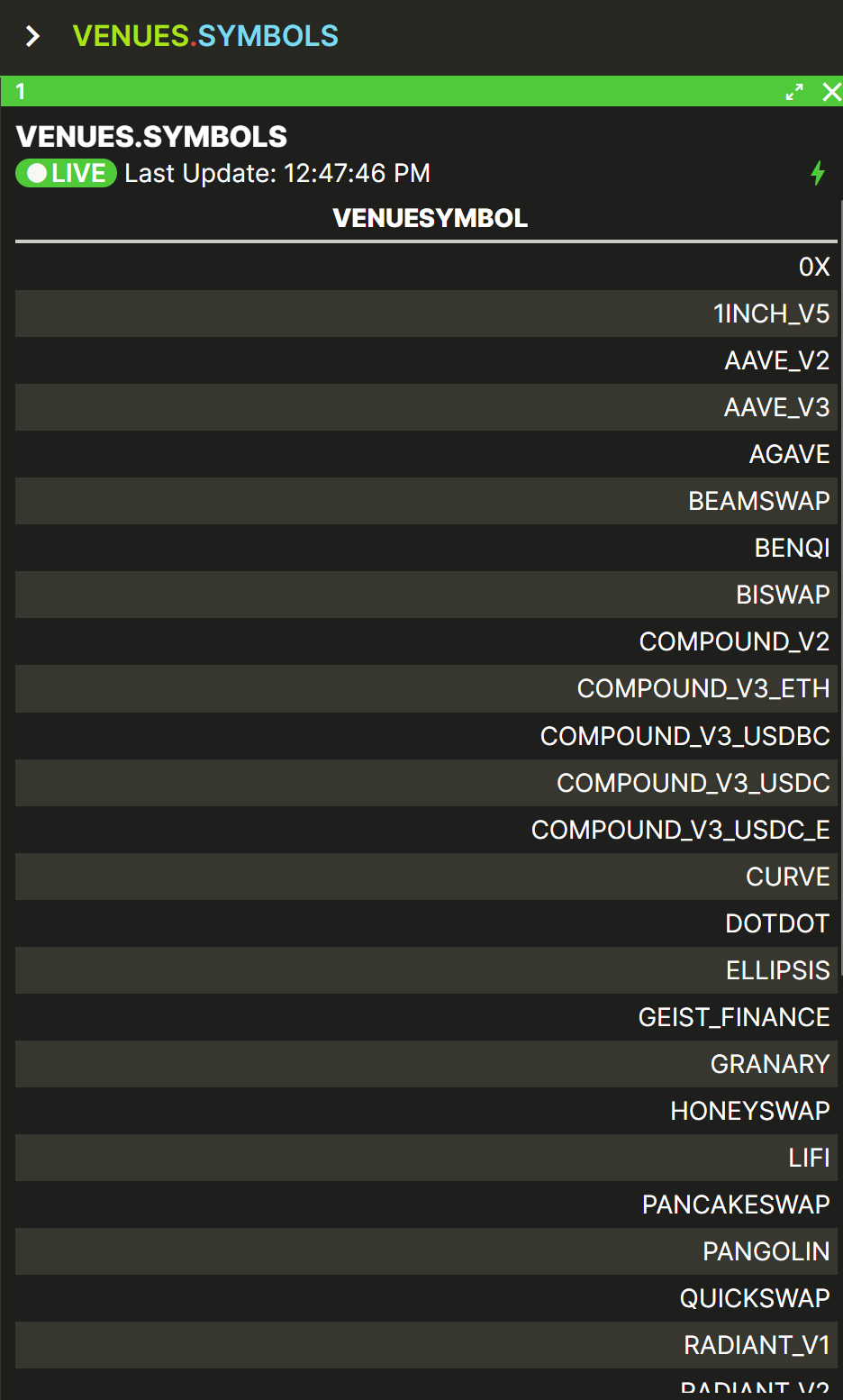You can see a list of supported venues at any time using the VENUES function. In Vektor, a single VENUE is represented by a venue name + blockchain combination. Thus: