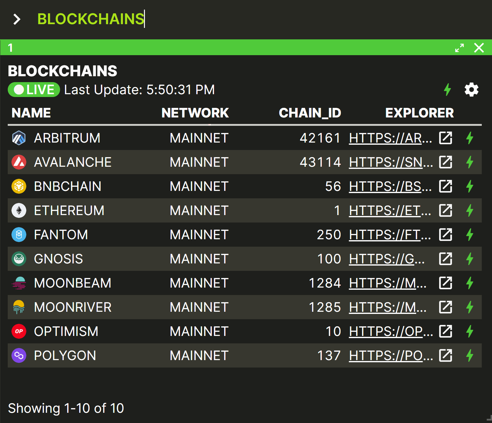 You can see a list of supported blockchains at any time in the app using the BLOCKCHAINS function.